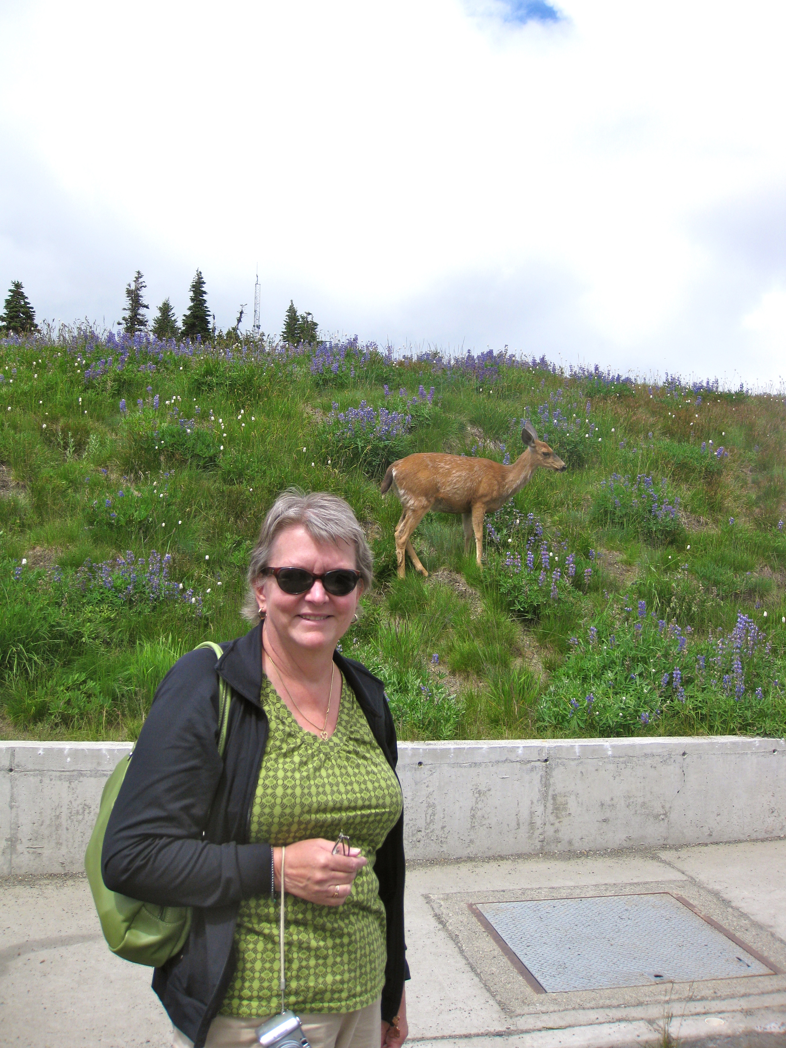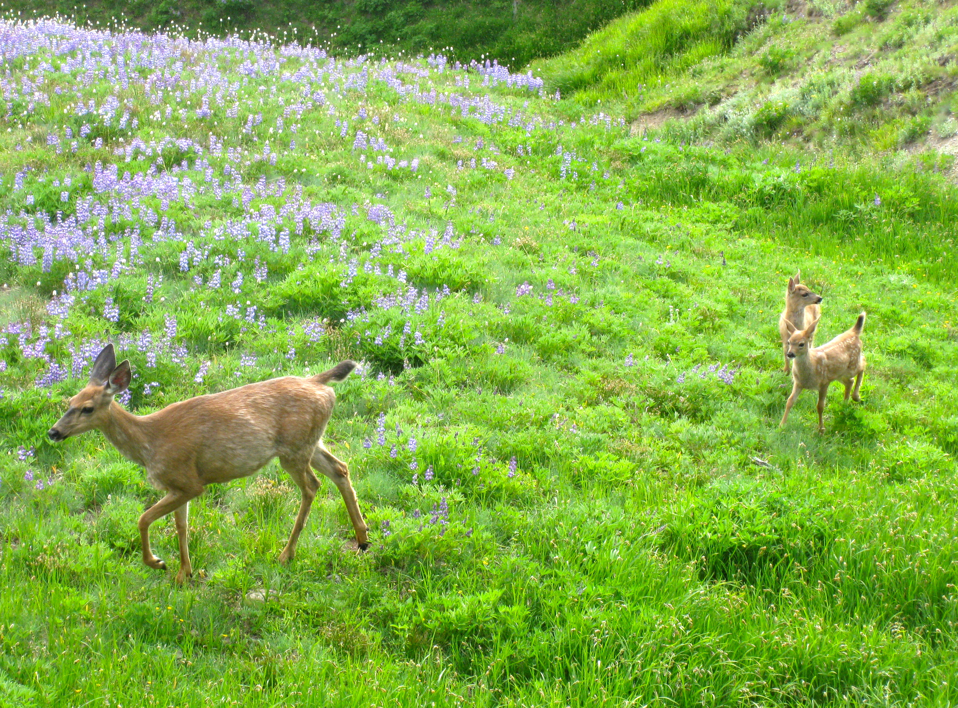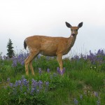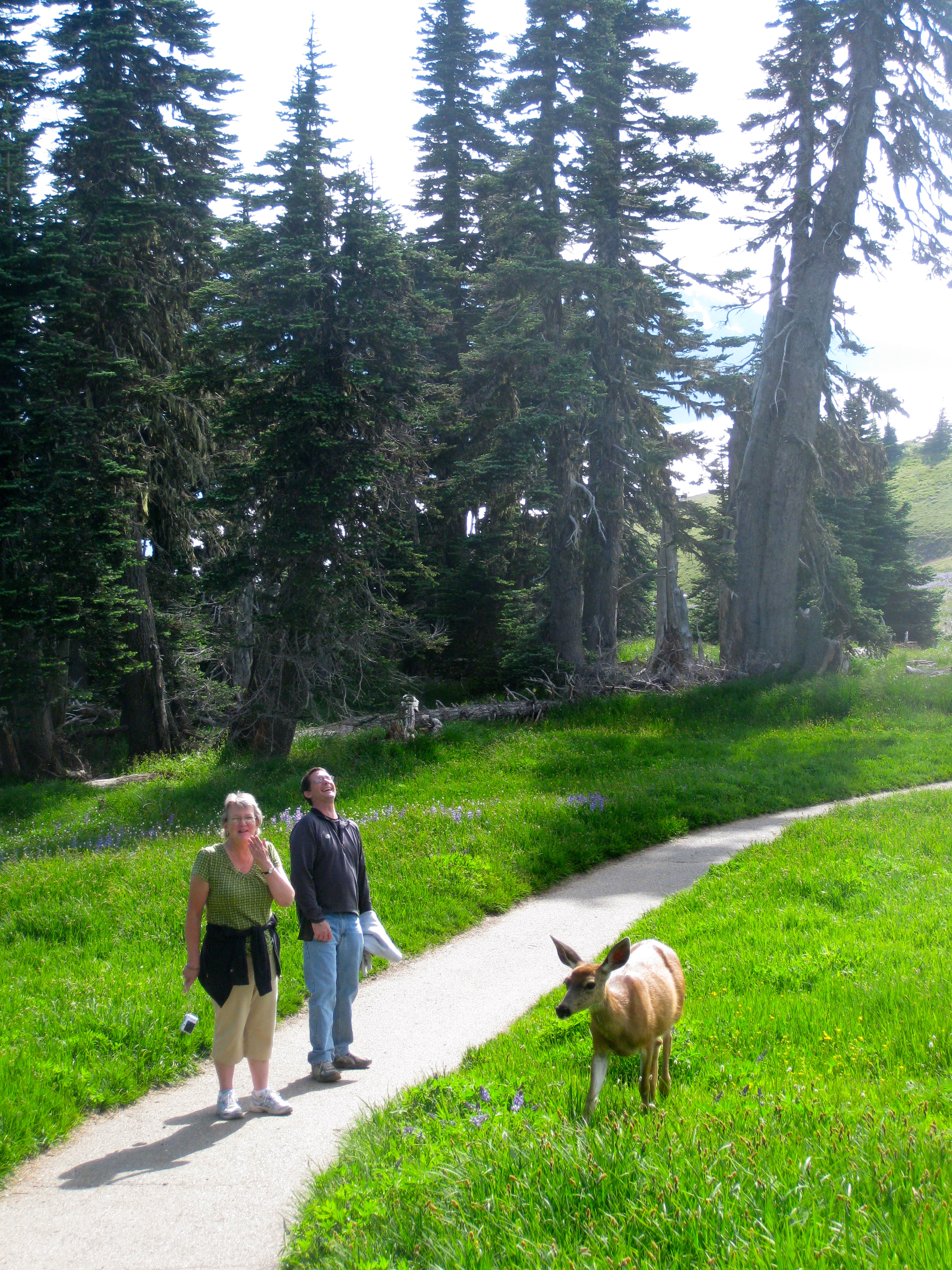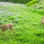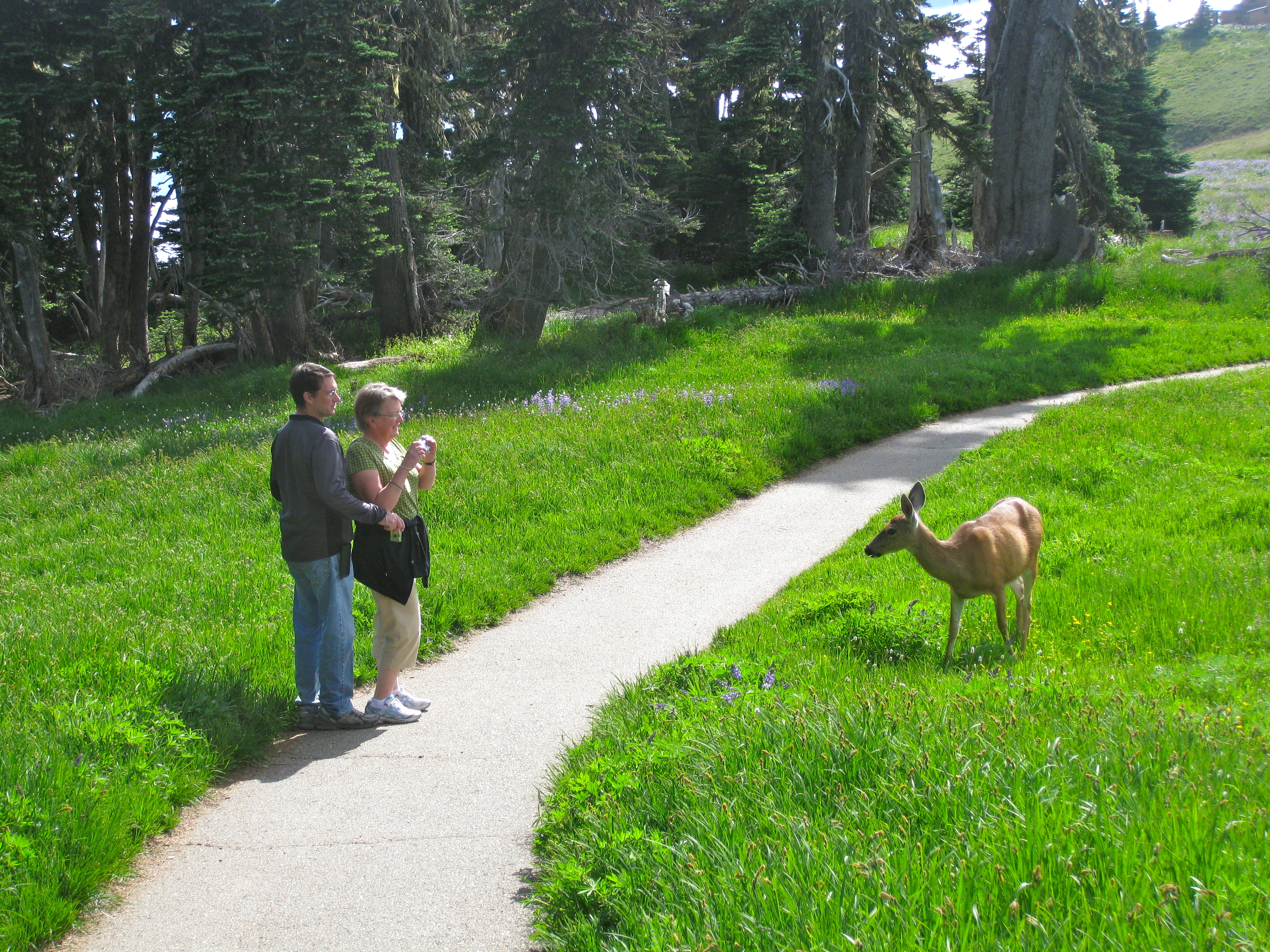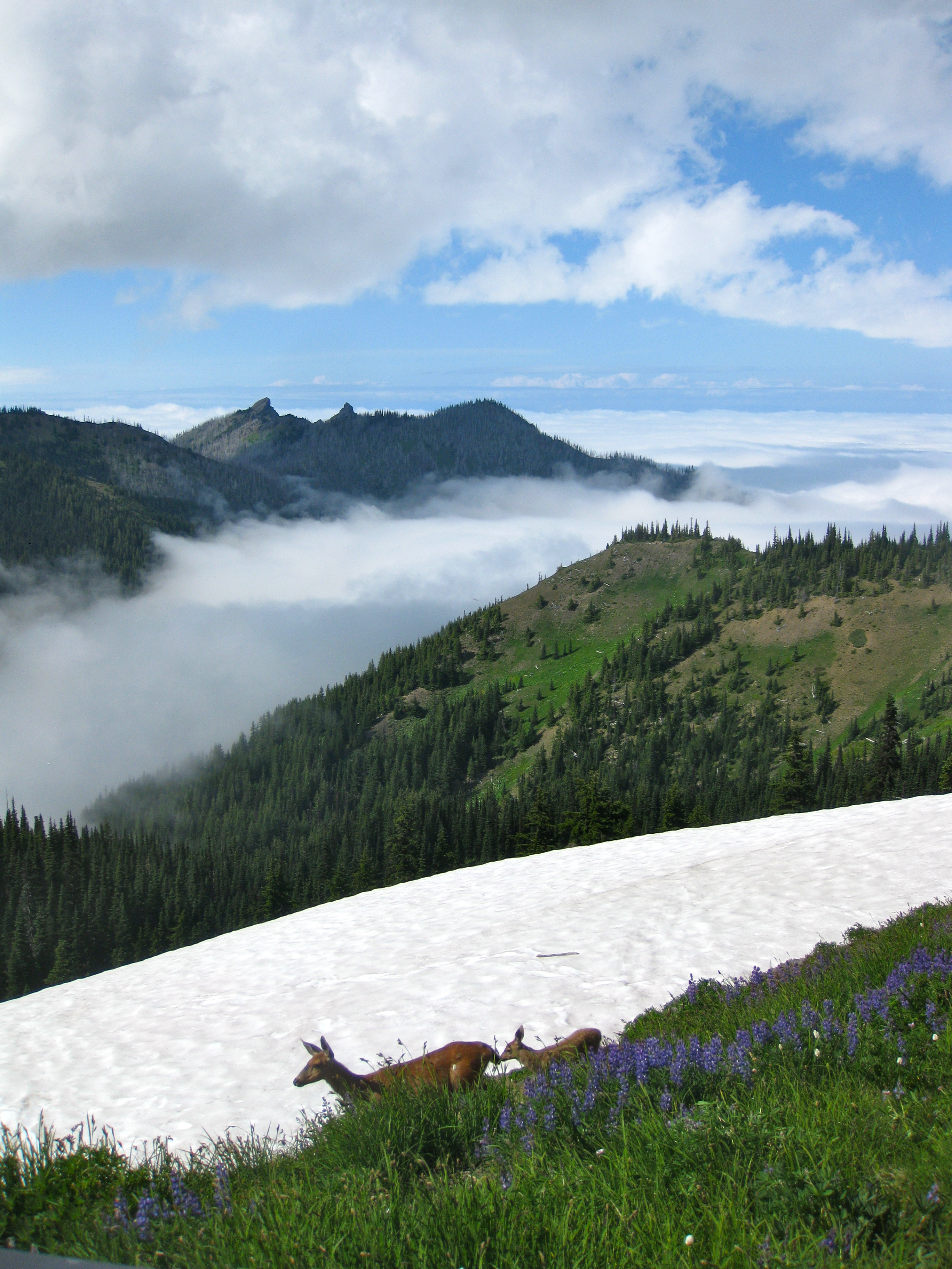Donning a few extra layers we took a look around the area; to the west stood Mt. Olympus and the rest of the Olympic range; behind us were fields of lupine (a purple alpine flower), and all around us, as the click of several cameras indicated, were deer with their yearling fawns, out grazing in the fields. Making our way toward the visitor center Mom drew close to a deer grazing on a hillside; apparently when there are as many of them on the ridge as there are squirrels in central park, they become fairly accustomed to tourists with cameras. I took the first of many shots just as a woman started clapping to scare the animal off, in the interest of not letting it get domesticated. She had, of course, become an animal behavior expert after she’d finished taking her own pictures; Mom gave her the evil eye “What the heck did she do that for?” I patted her on the back and glared right along with her–damn right, Mom. The deer stuck around anyway.