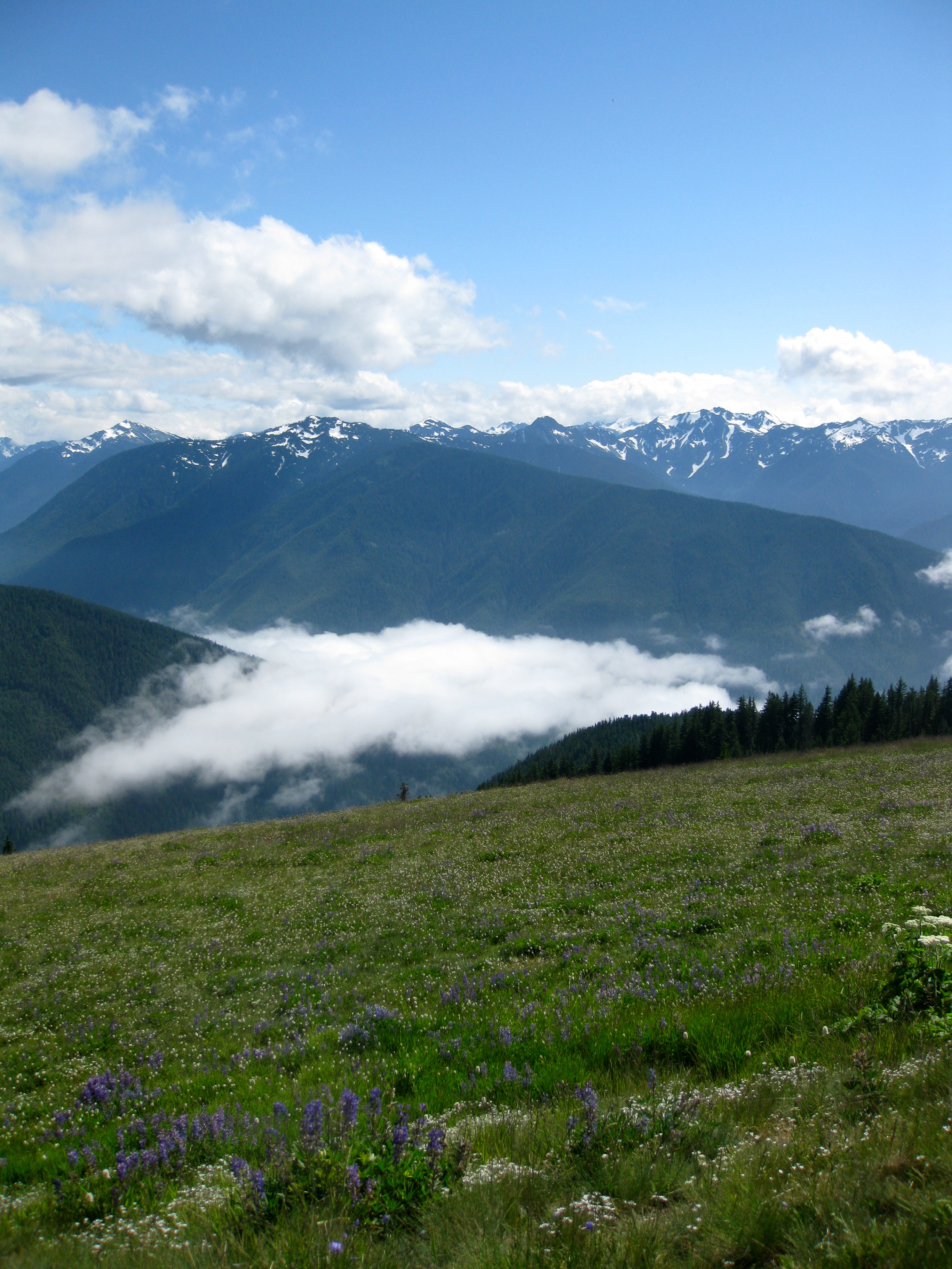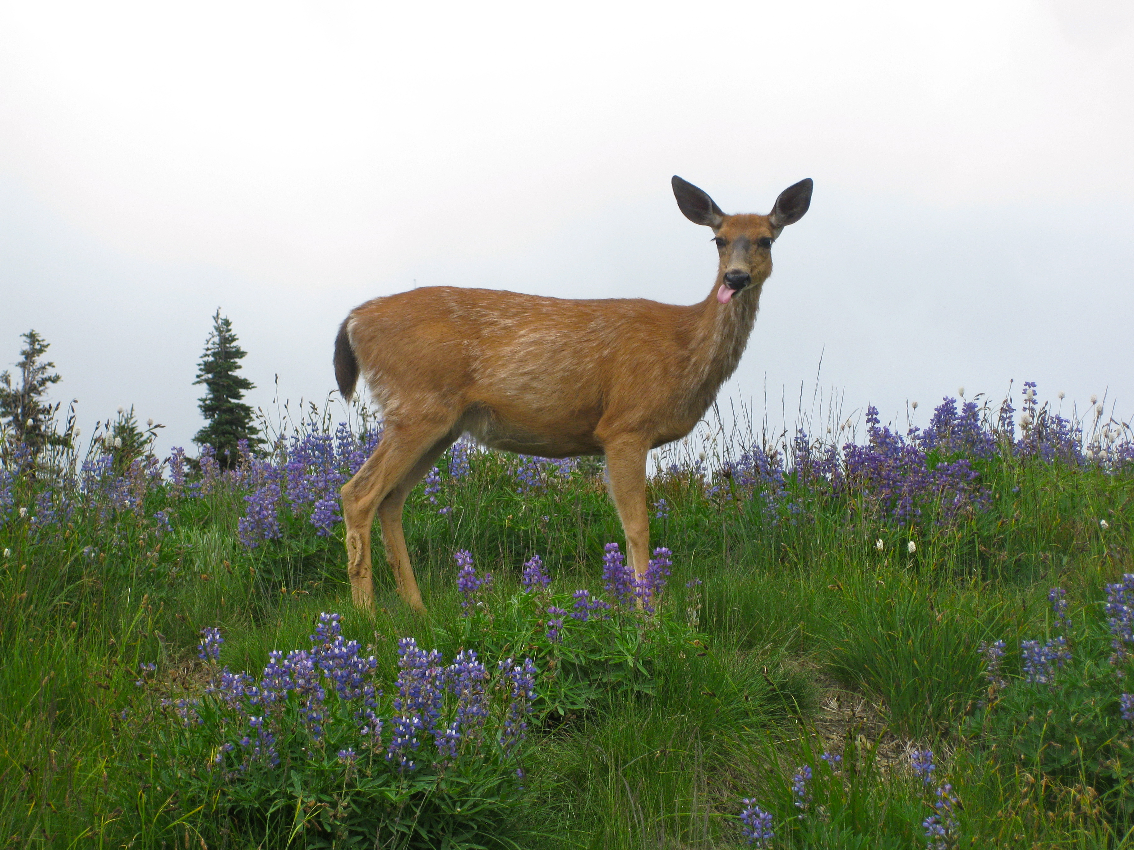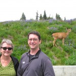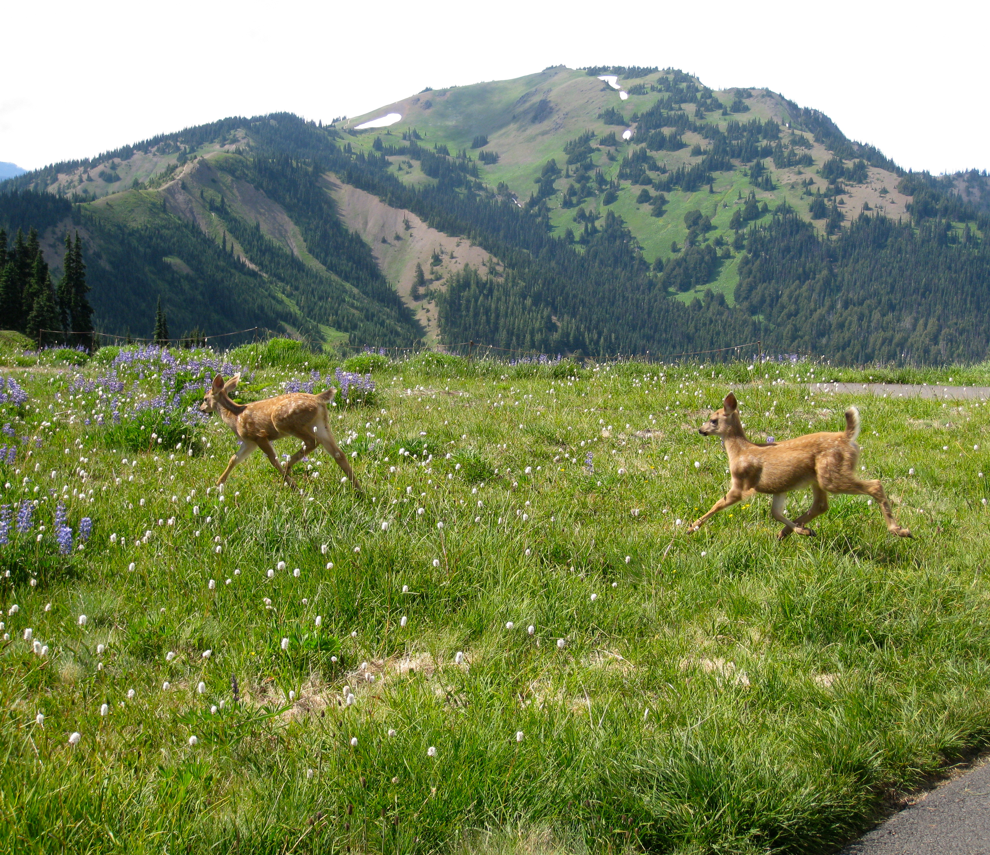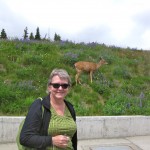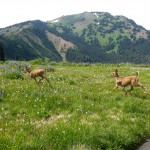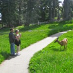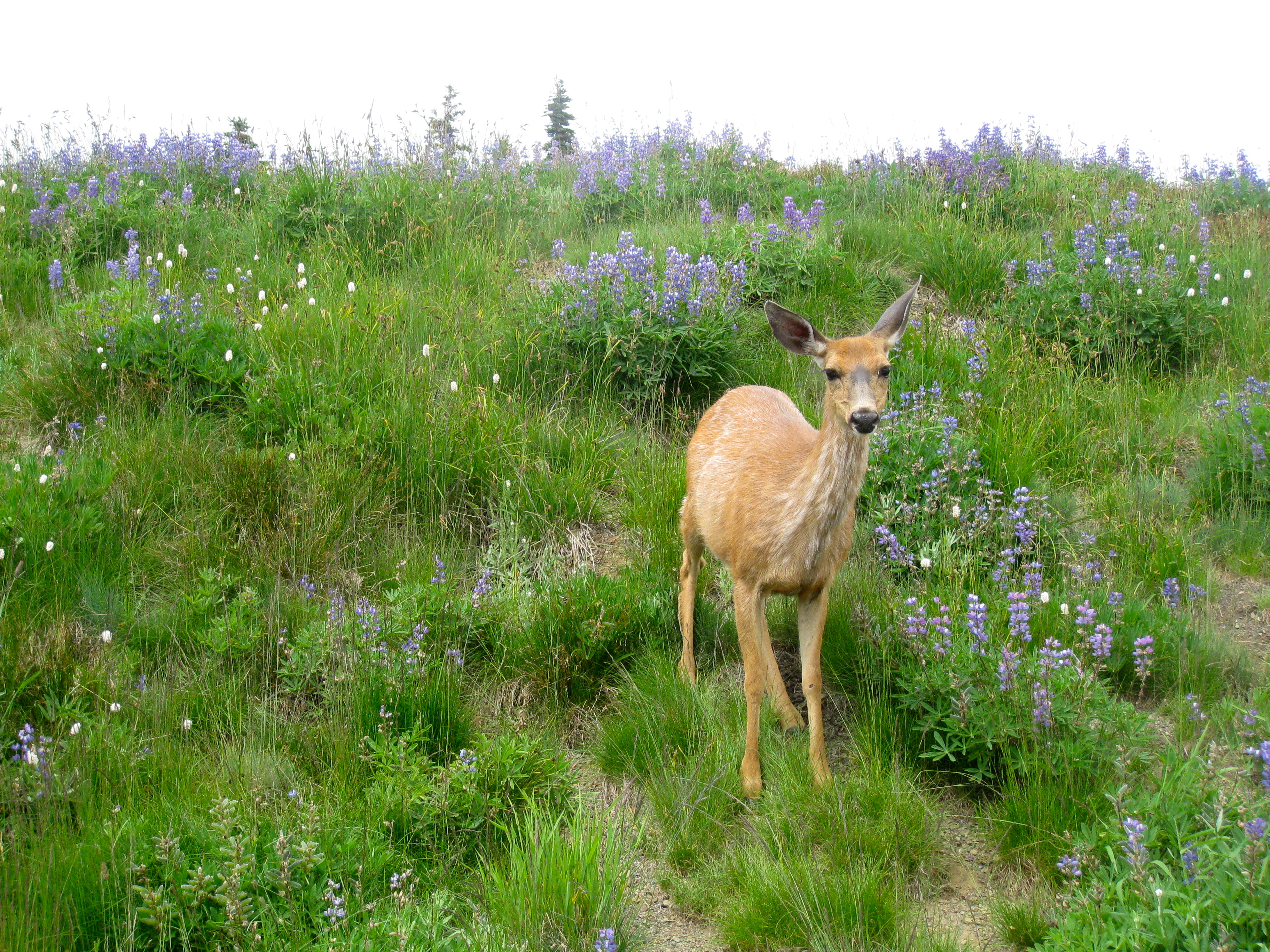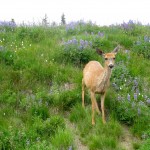 Donning a few extra layers we took a look around the area; to the west stood Mt. Olympus and the rest of the Olympic range; behind us were fields of lupine (a purple alpine flower), and all around us, as the click of several cameras indicated, were deer with their yearling fawns, out grazing in the fields. Making our way toward the visitor center Mom drew close to a deer grazing on a hillside; apparently when there are as many of them on the ridge as there are squirrels in central park, they become fairly accustomed to tourists with cameras. I took the first of many shots just as a woman started clapping to scare the animal off, in the interest of not letting it get domesticated. She had, of course, become an animal behavior expert after she’d finished taking her own pictures; Mom gave her the evil eye “What the heck did she do that for?” I patted her on the back and glared right along with her–damn right, Mom. The deer stuck around anyway.