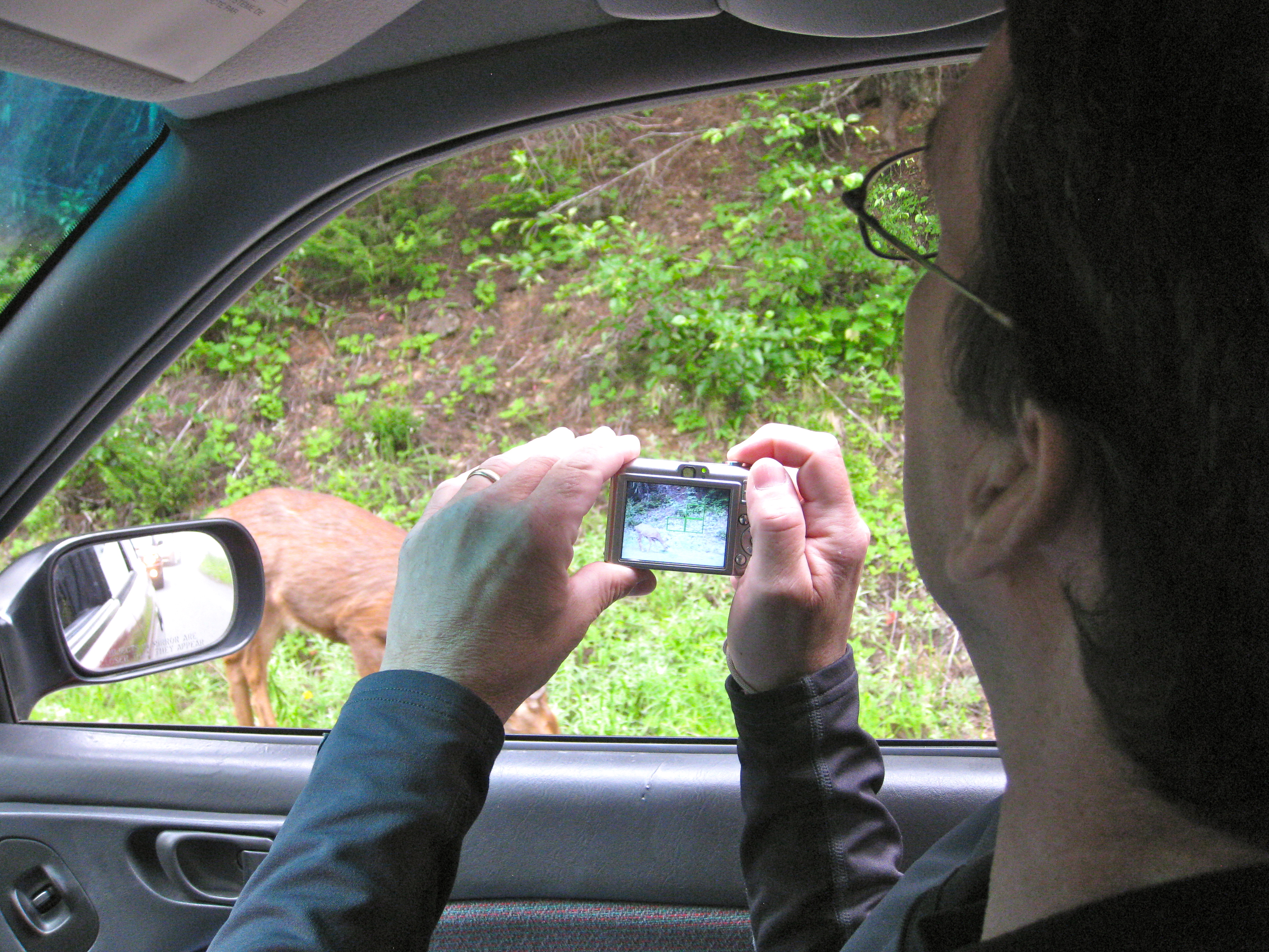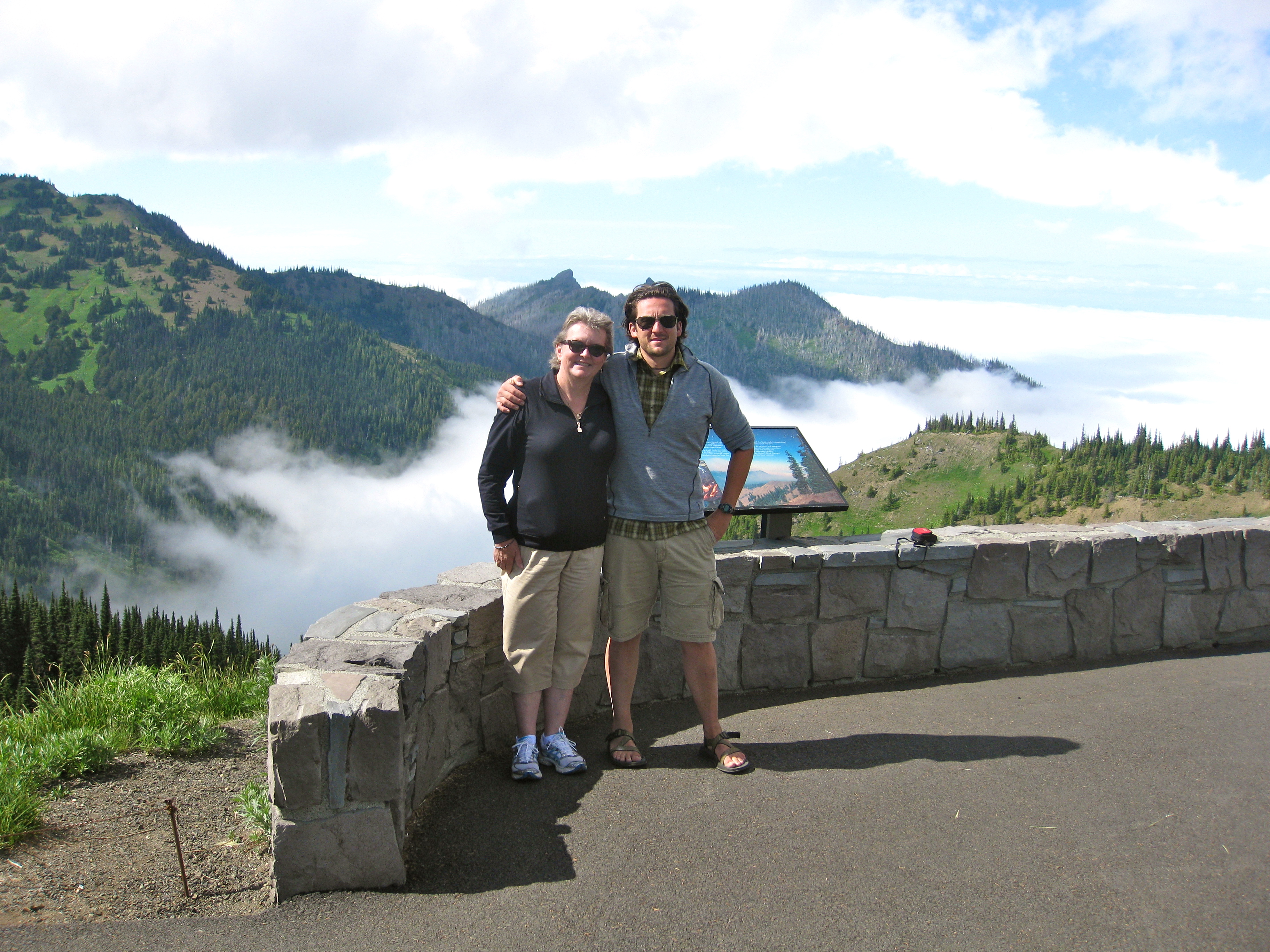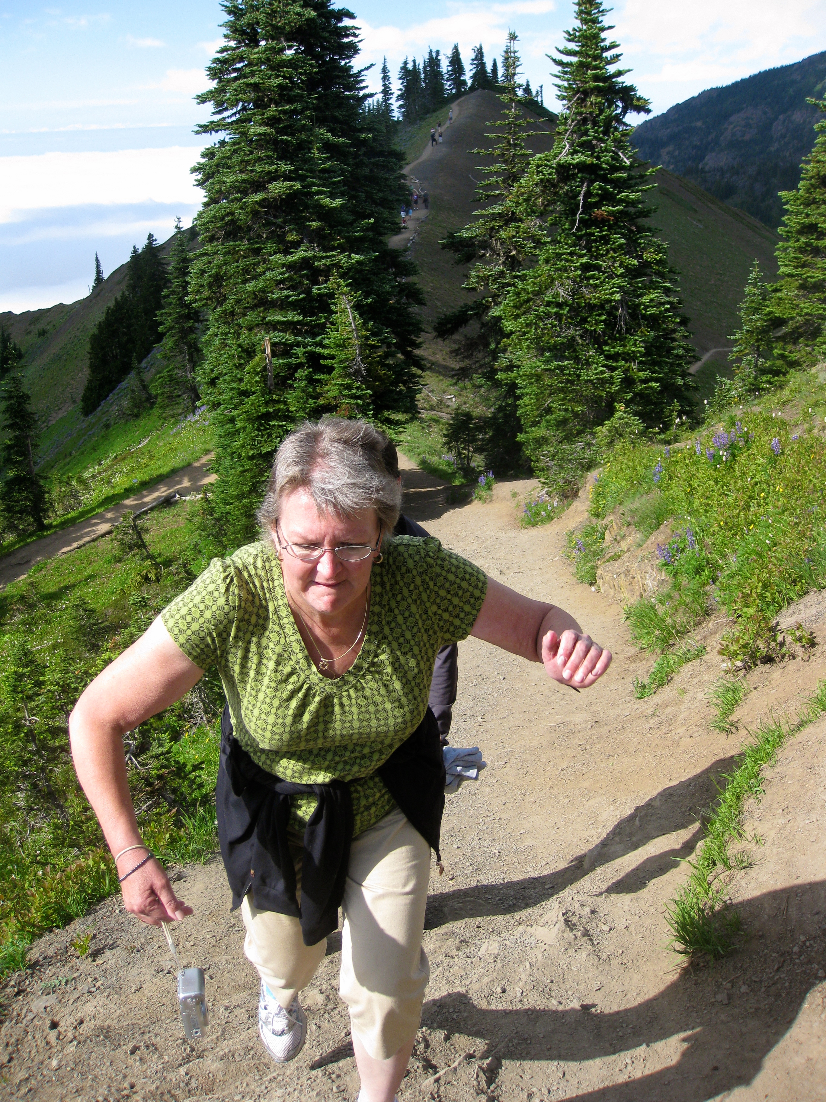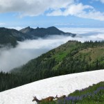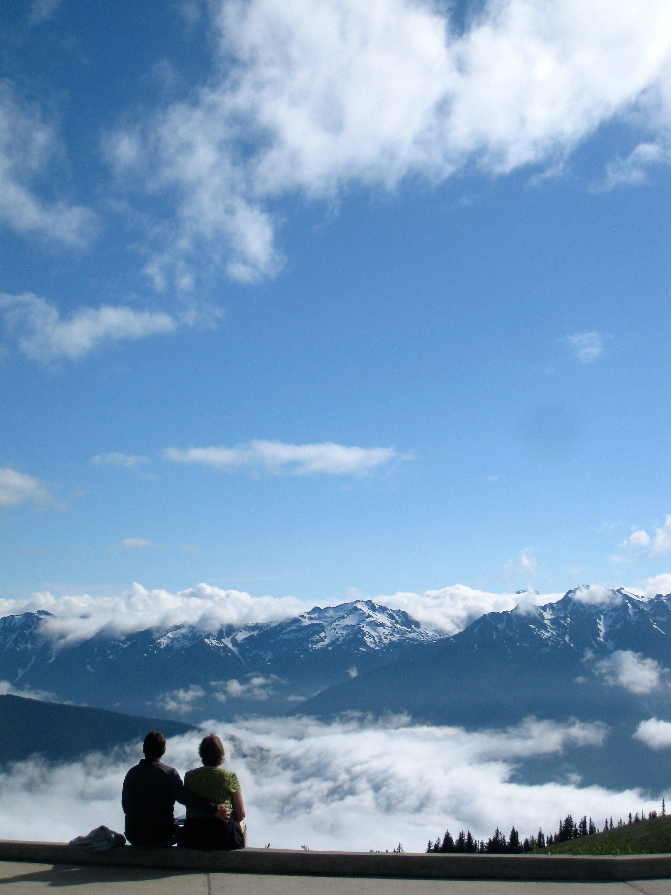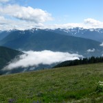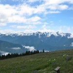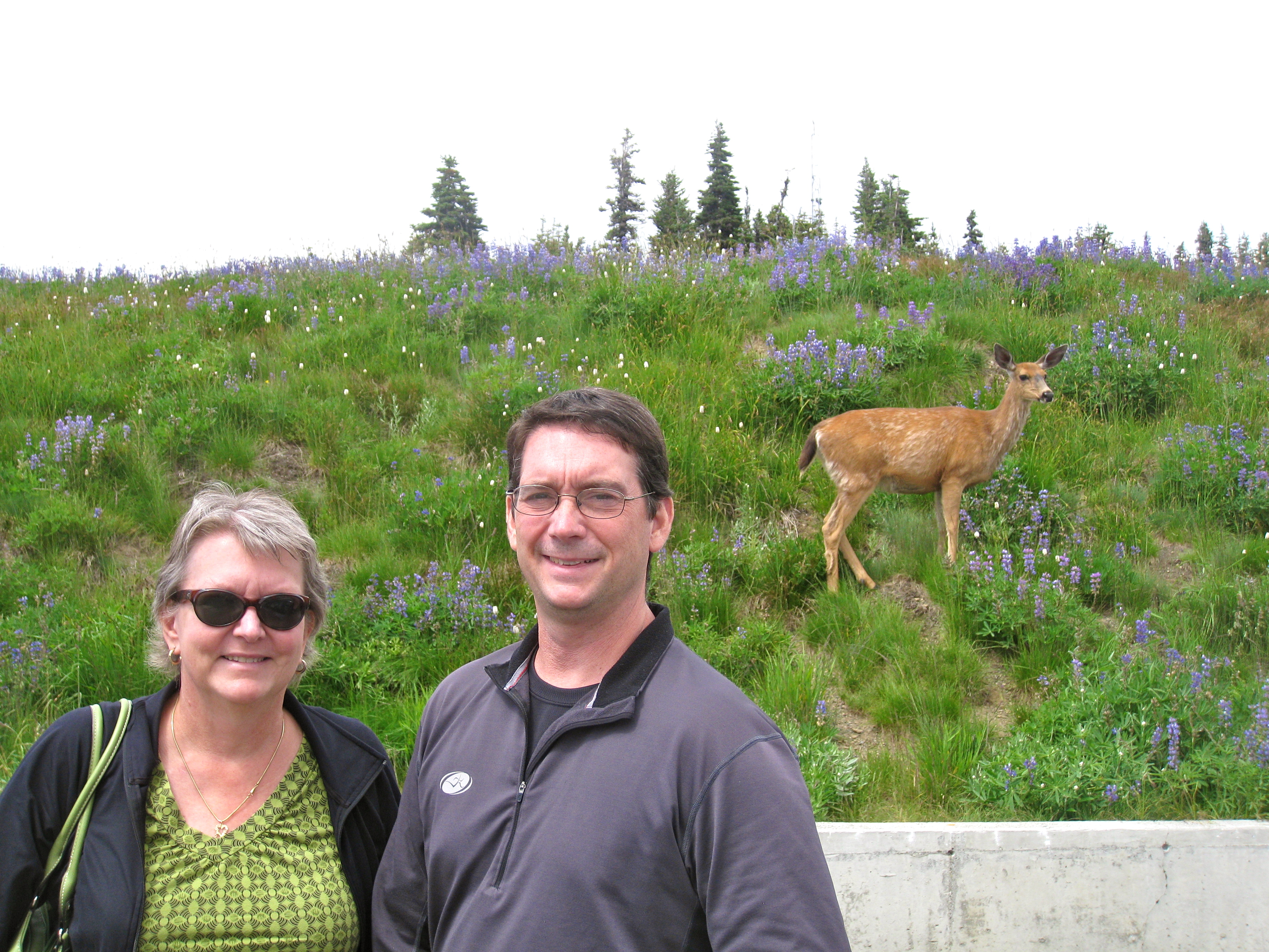 Donning a few extra layers we took a look around the area; to the west stood Mt. Olympus and the rest of the Olympic range; behind us were fields of lupine (a purple alpine flower), and all around us, as the click of several cameras indicated, were deer with their yearling fawns, out grazing in the fields. Making our way toward the visitor center Mom drew close to a deer grazing on a hillside; apparently when there are as many of them on the ridge as there are squirrels in central park, they become fairly accustomed to tourists with cameras. I took the first of many shots just as a woman started clapping to scare the animal off, in the interest of not letting it get domesticated. She had, of course, become an animal behavior expert after she’d finished taking her own pictures; Mom gave her the evil eye “What the heck did she do that for?” I patted her on the back and glared right along with her–damn right, Mom. The deer stuck around anyway.