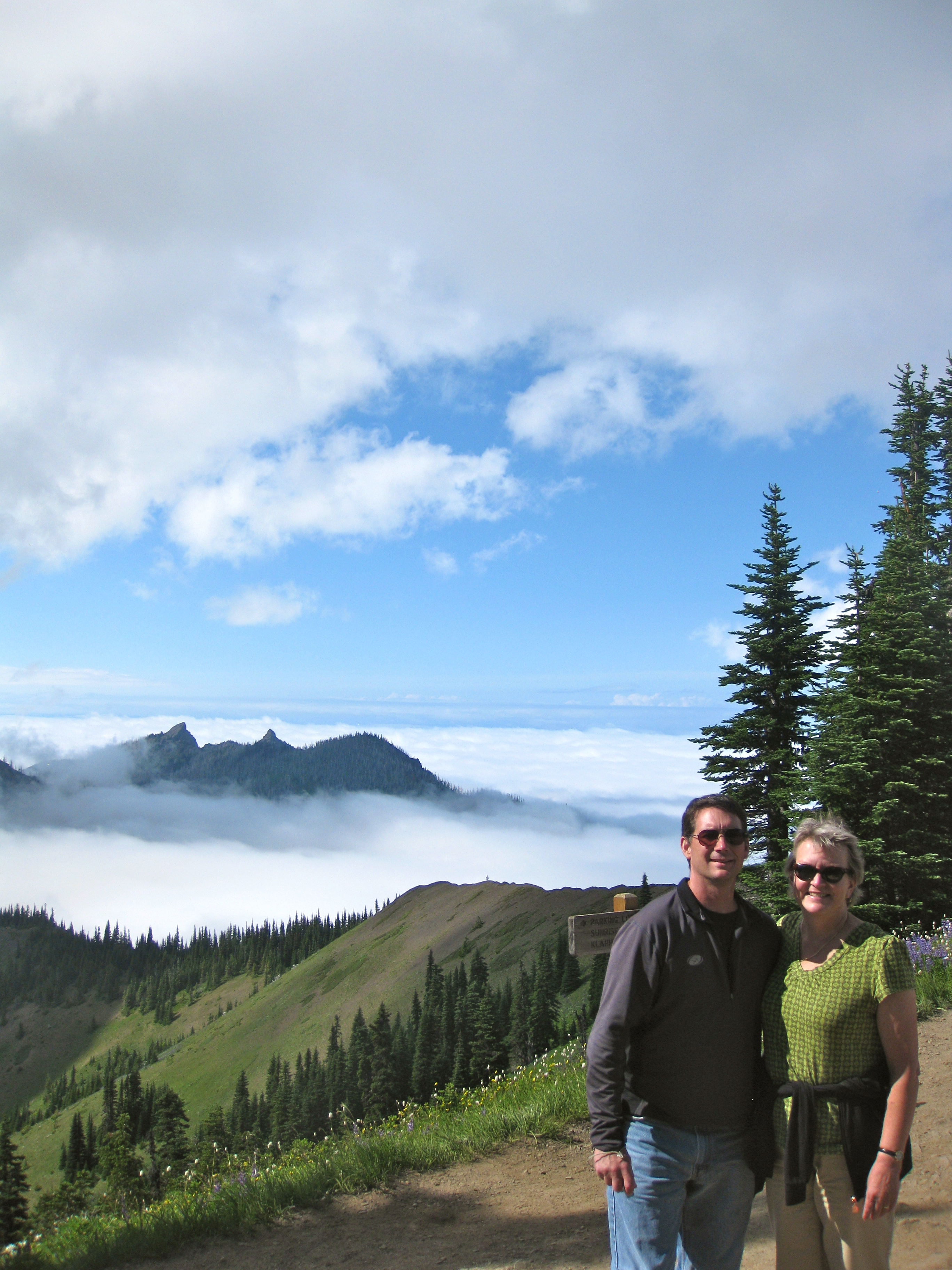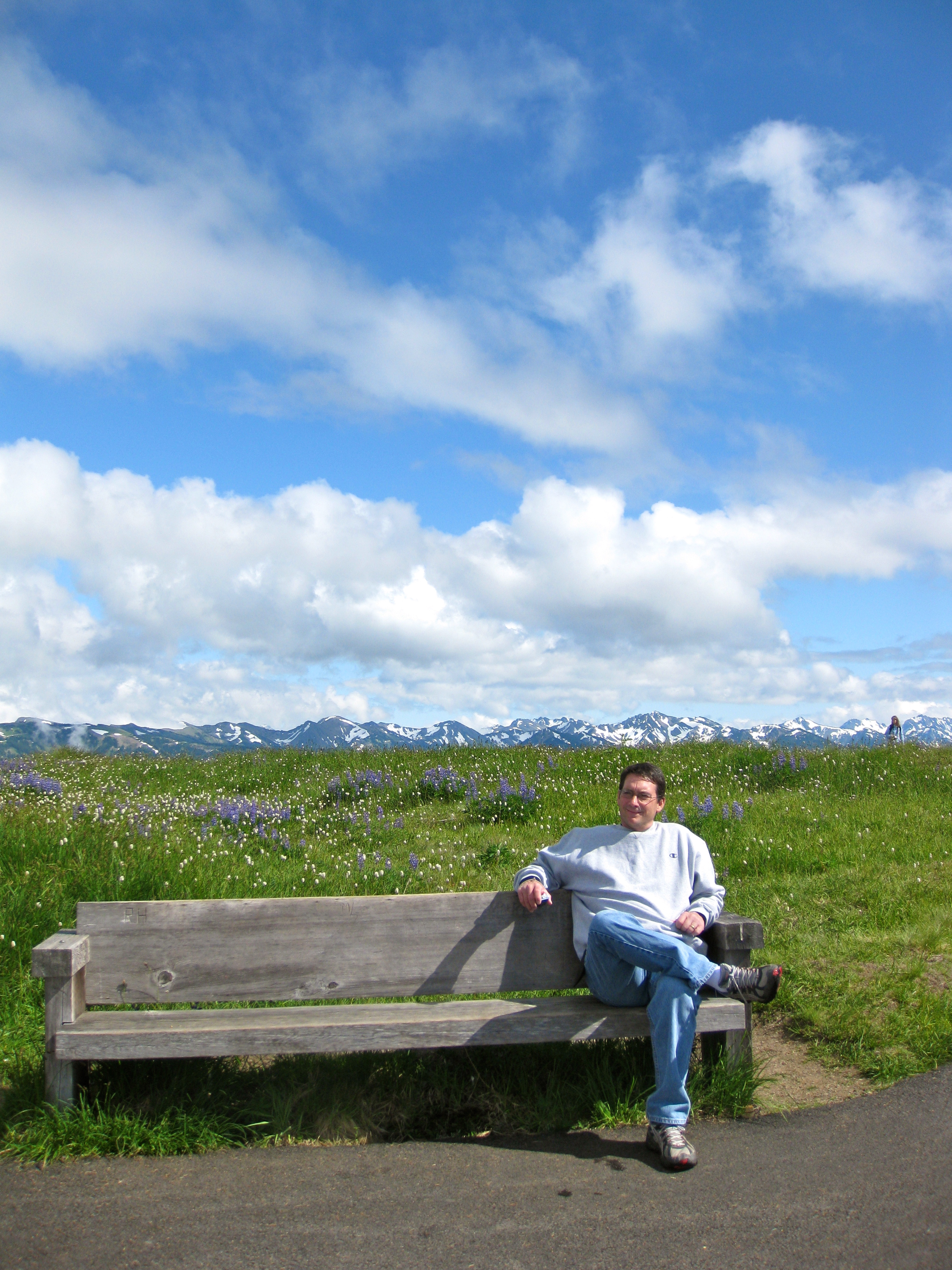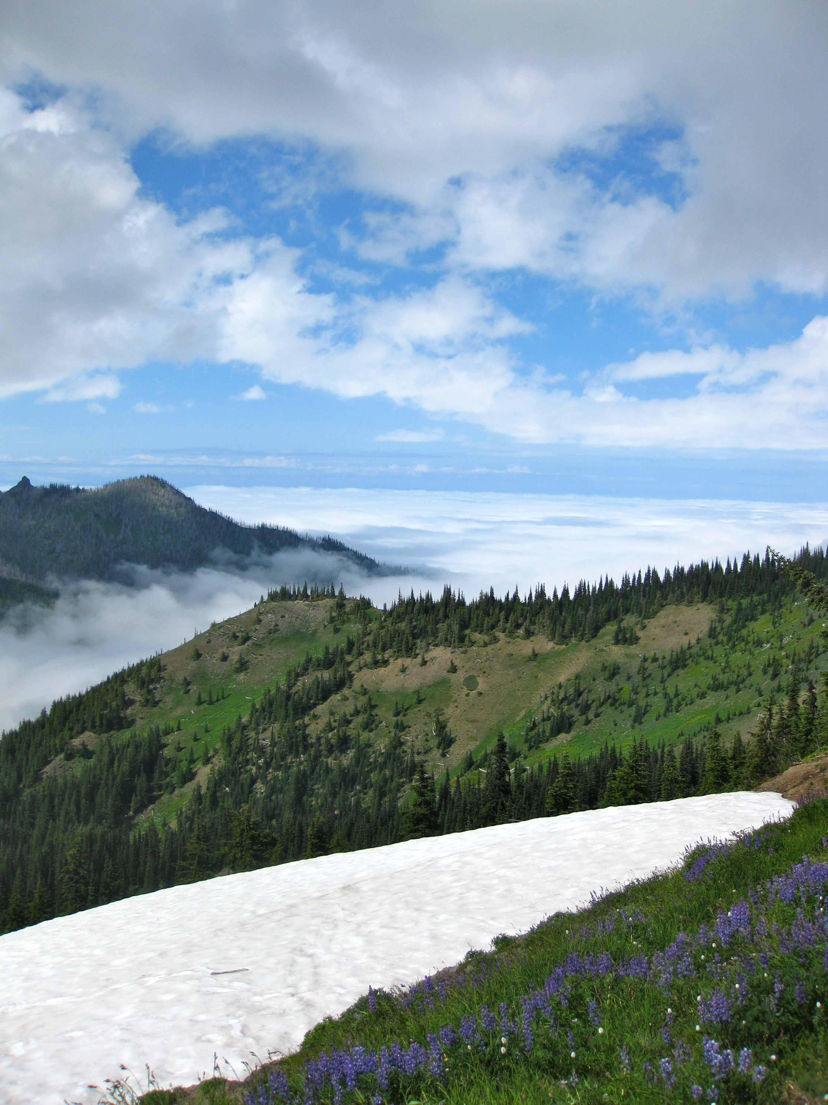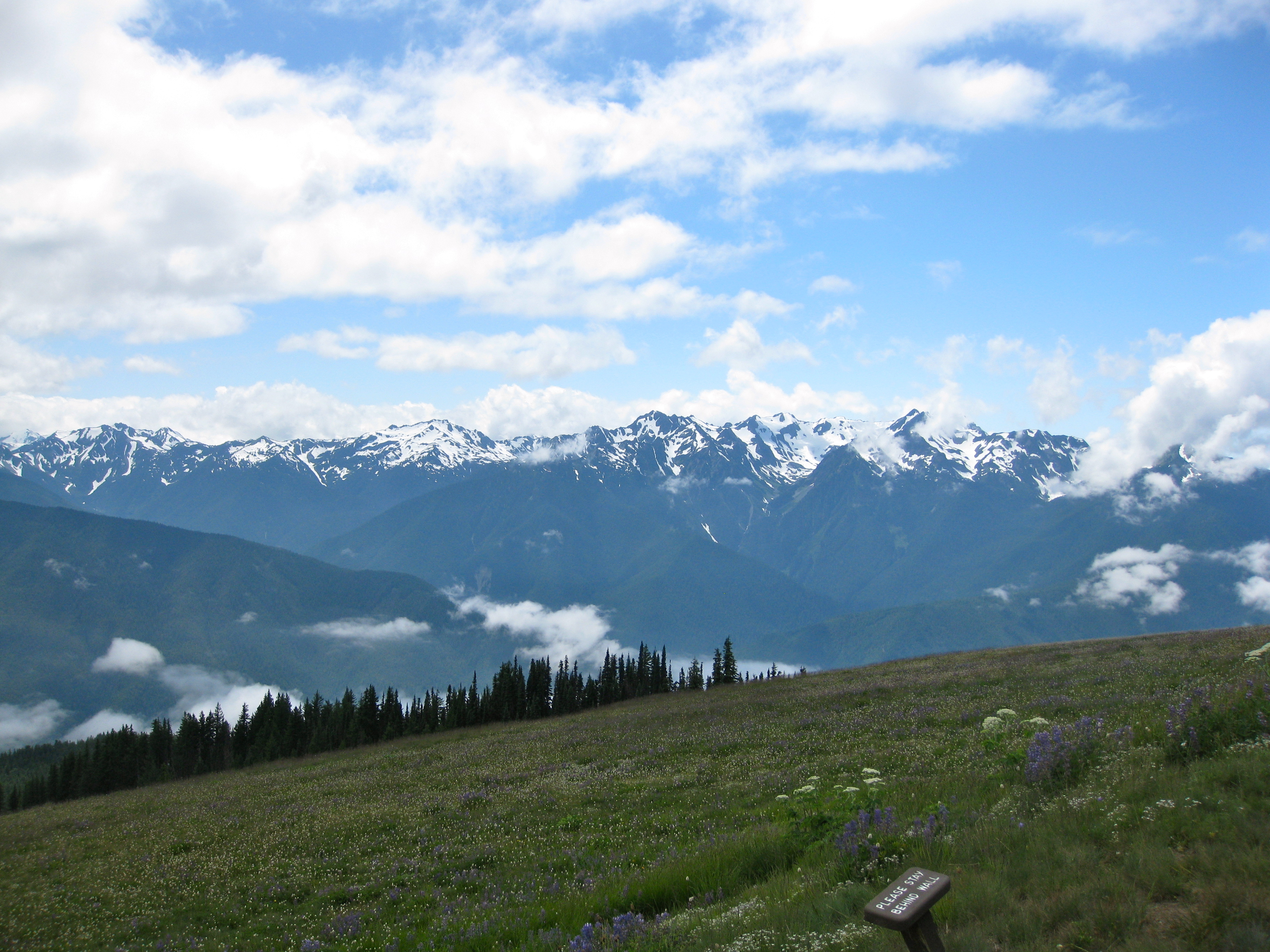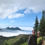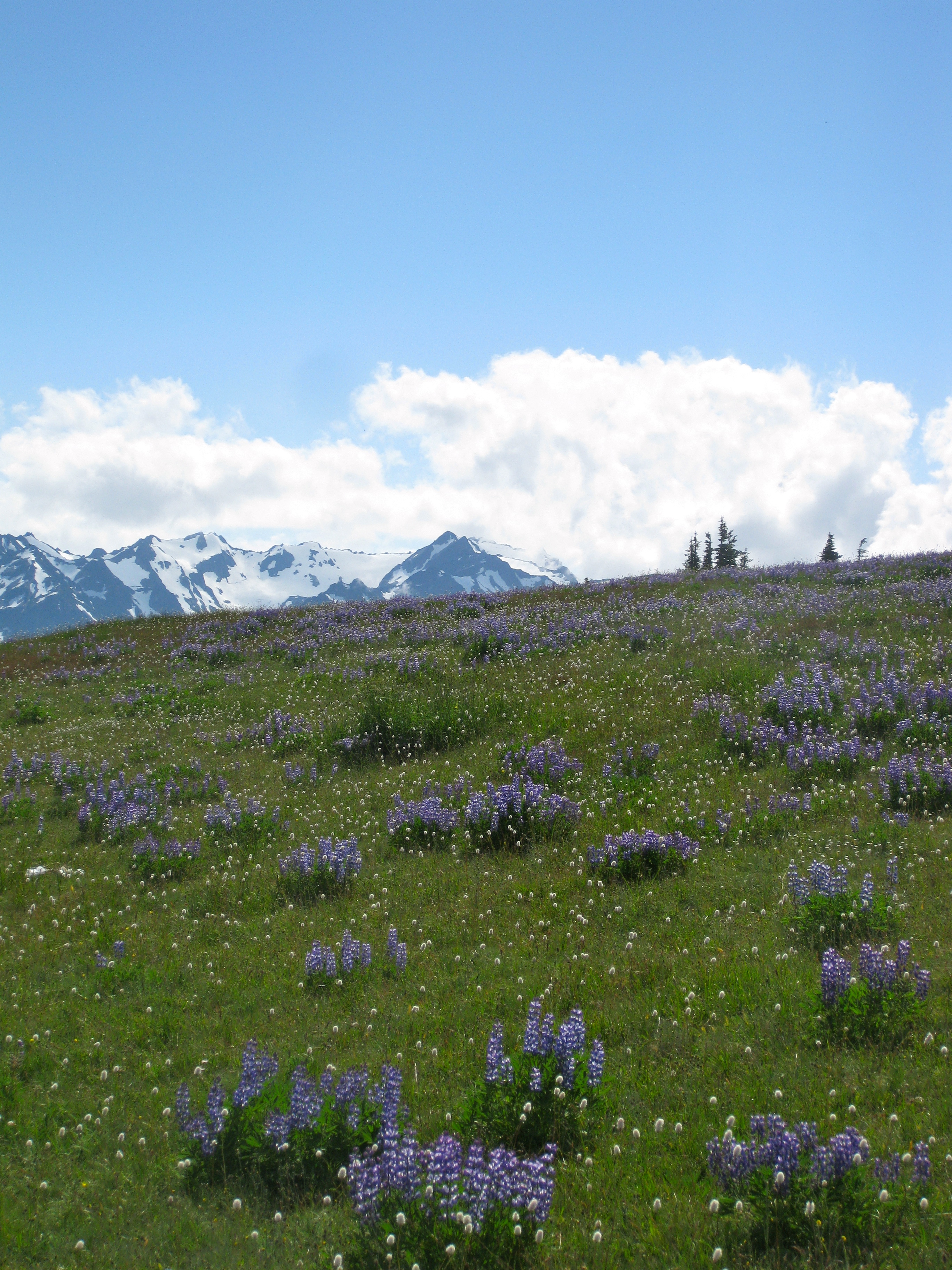 Donning a few extra layers we took a look around the area; to the west stood Mt. Olympus and the rest of the Olympic range; behind us were fields of lupine (a purple alpine flower), and all around us, as the click of several cameras indicated, were deer with their yearling fawns, out grazing in the fields. Making our way toward the visitor center Mom drew close to a deer grazing on a hillside; apparently when there are as many of them on the ridge as there are squirrels in central park, they become fairly accustomed to tourists with cameras. I took the first of many shots just as a woman started clapping to scare the animal off, in the interest of not letting it get domesticated. She had, of course, become an animal behavior expert after she’d finished taking her own pictures; Mom gave her the evil eye “What the heck did she do that for?” I patted her on the back and glared right along with her–damn right, Mom. The deer stuck around anyway.