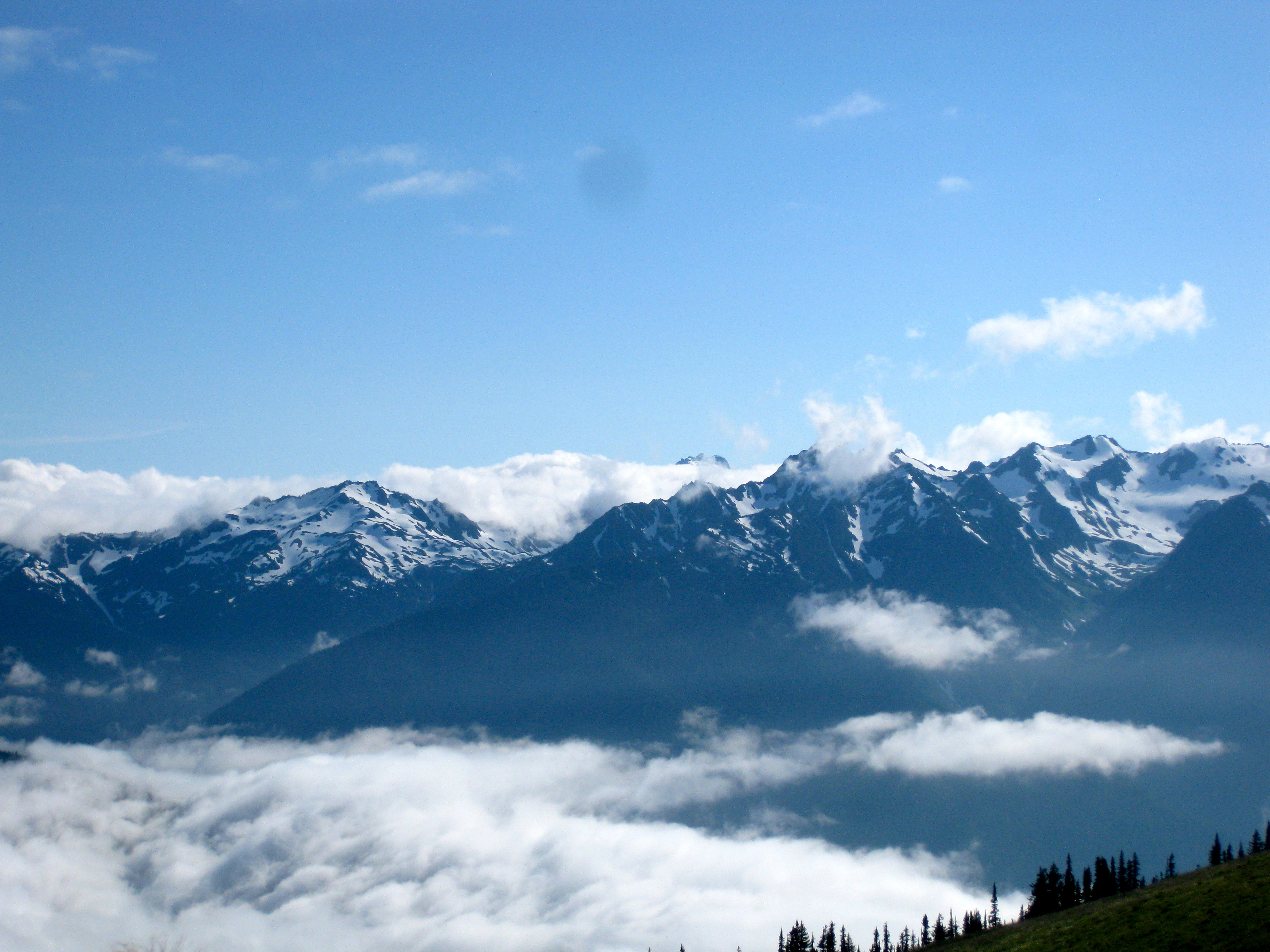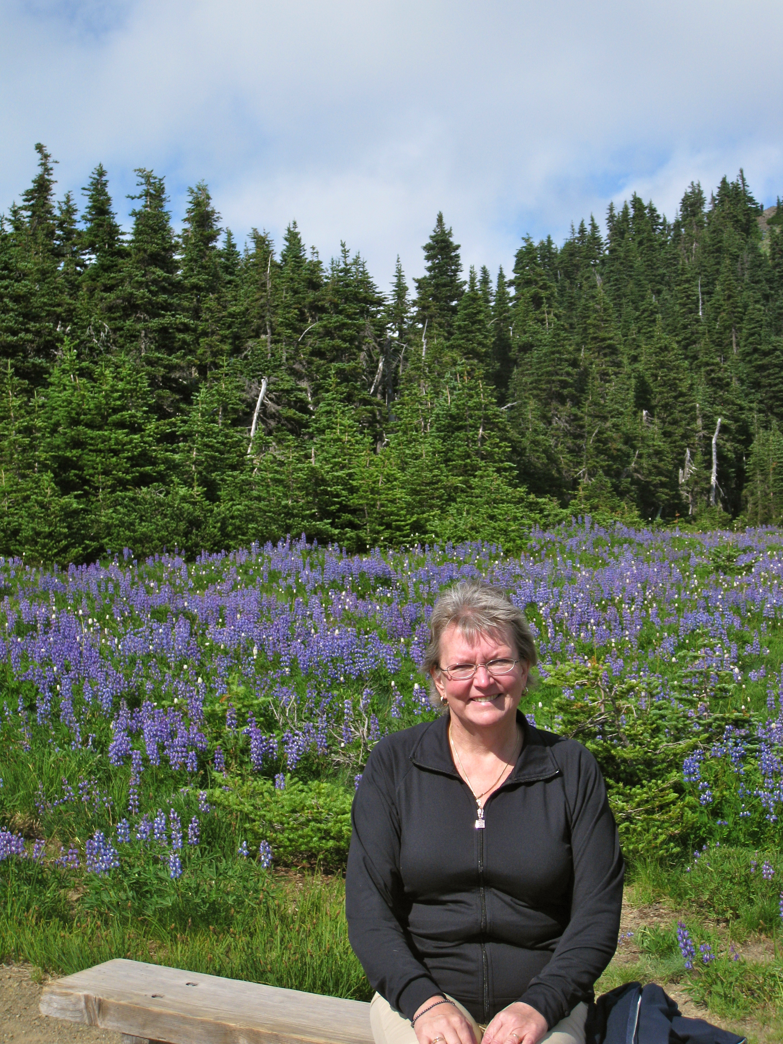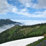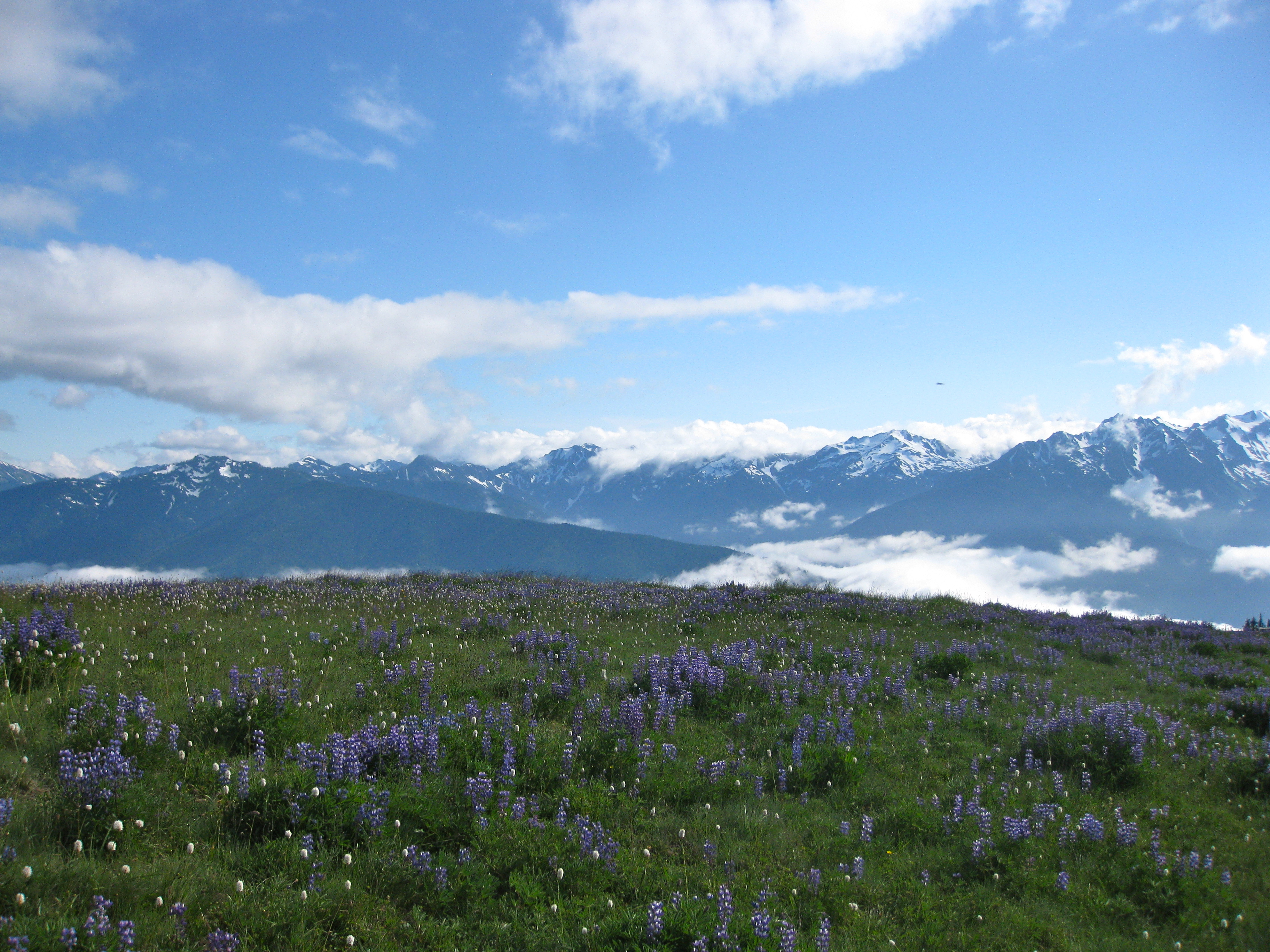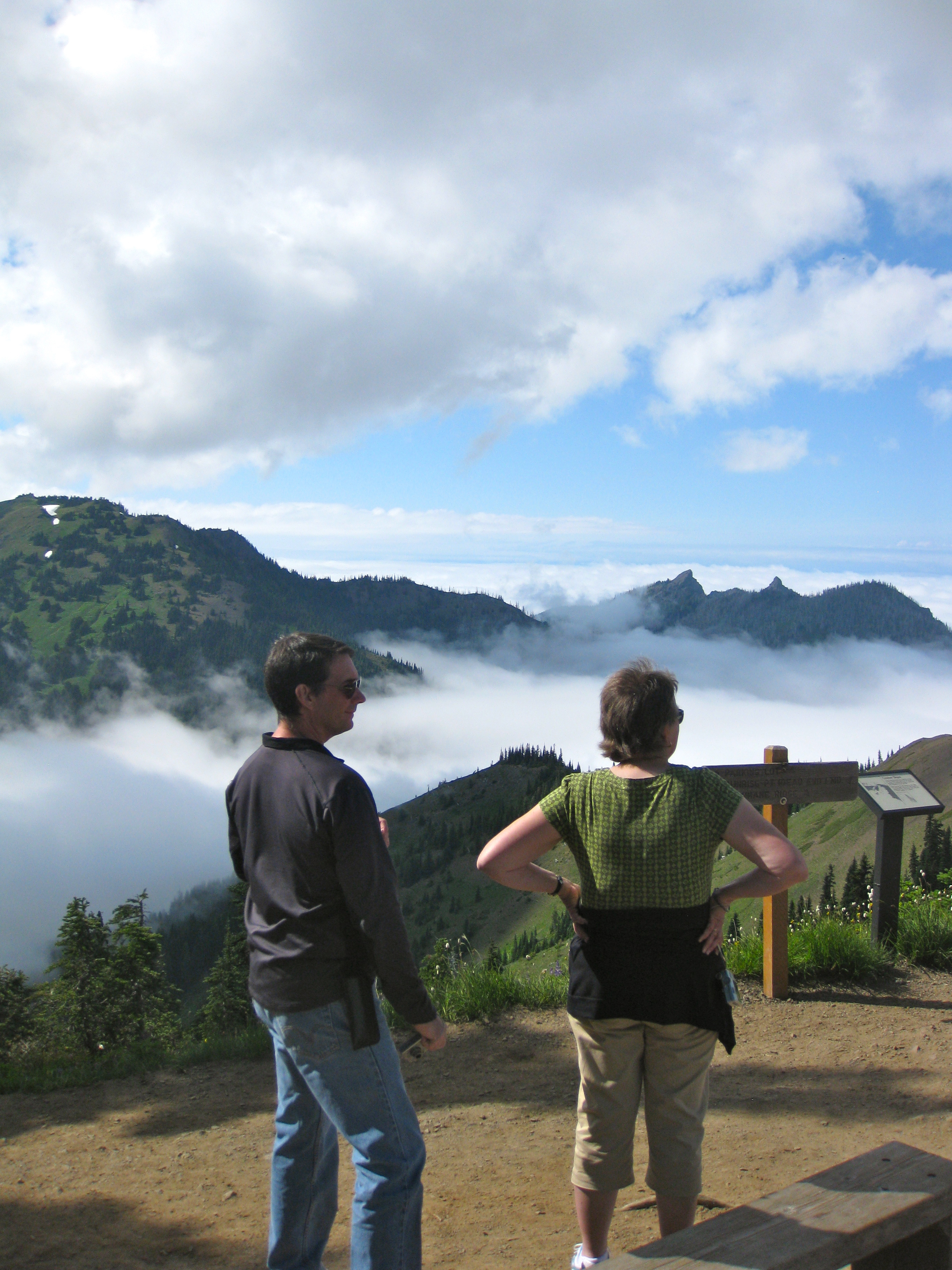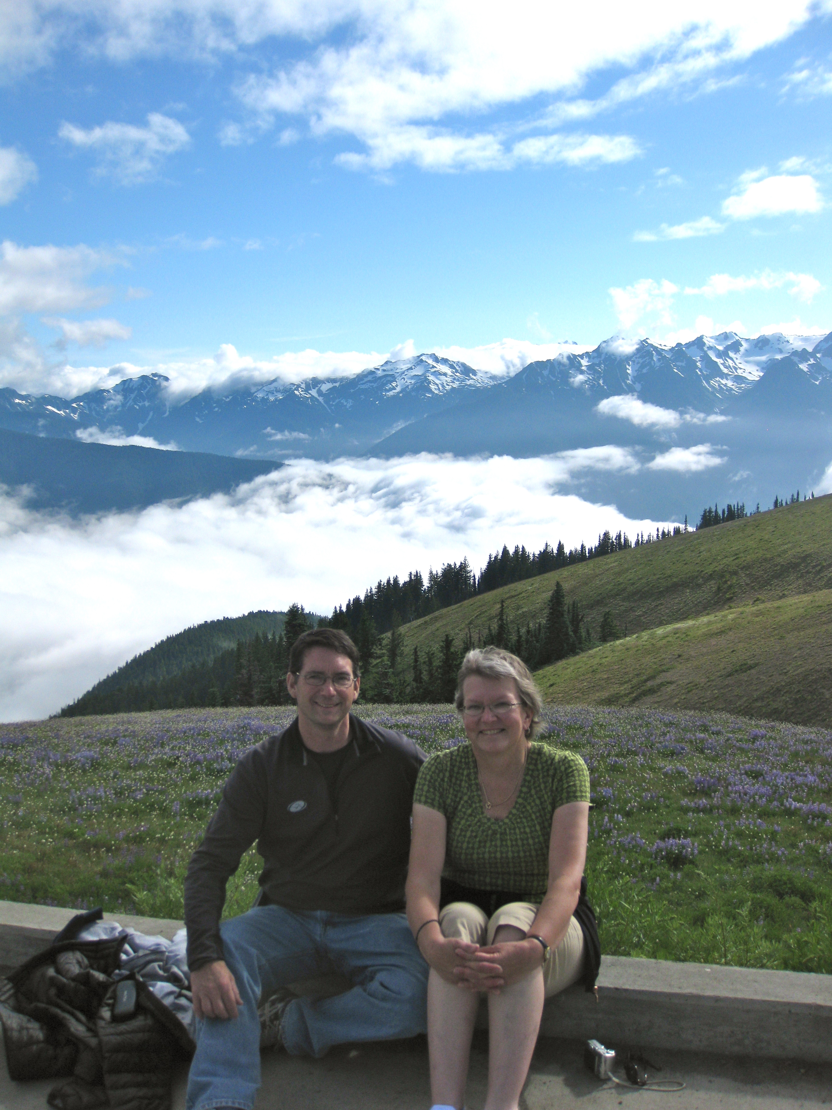 Donning a few extra layers we took a look around the area; to the west stood Mt. Olympus and the rest of the Olympic range; behind us were fields of lupine (a purple alpine flower), and all around us, as the click of several cameras indicated, were deer with their yearling fawns, out grazing in the fields. Making our way toward the visitor center Mom drew close to a deer grazing on a hillside; apparently when there are as many of them on the ridge as there are squirrels in central park, they become fairly accustomed to tourists with cameras. I took the first of many shots just as a woman started clapping to scare the animal off, in the interest of not letting it get domesticated. She had, of course, become an animal behavior expert after she’d finished taking her own pictures; Mom gave her the evil eye “What the heck did she do that for?” I patted her on the back and glared right along with her–damn right, Mom. The deer stuck around anyway.
