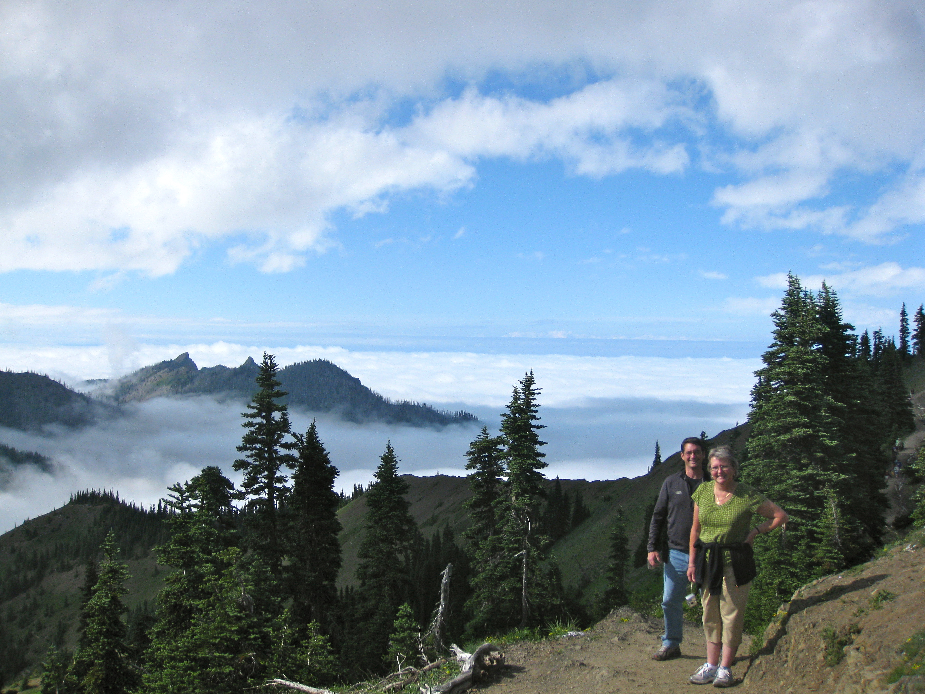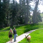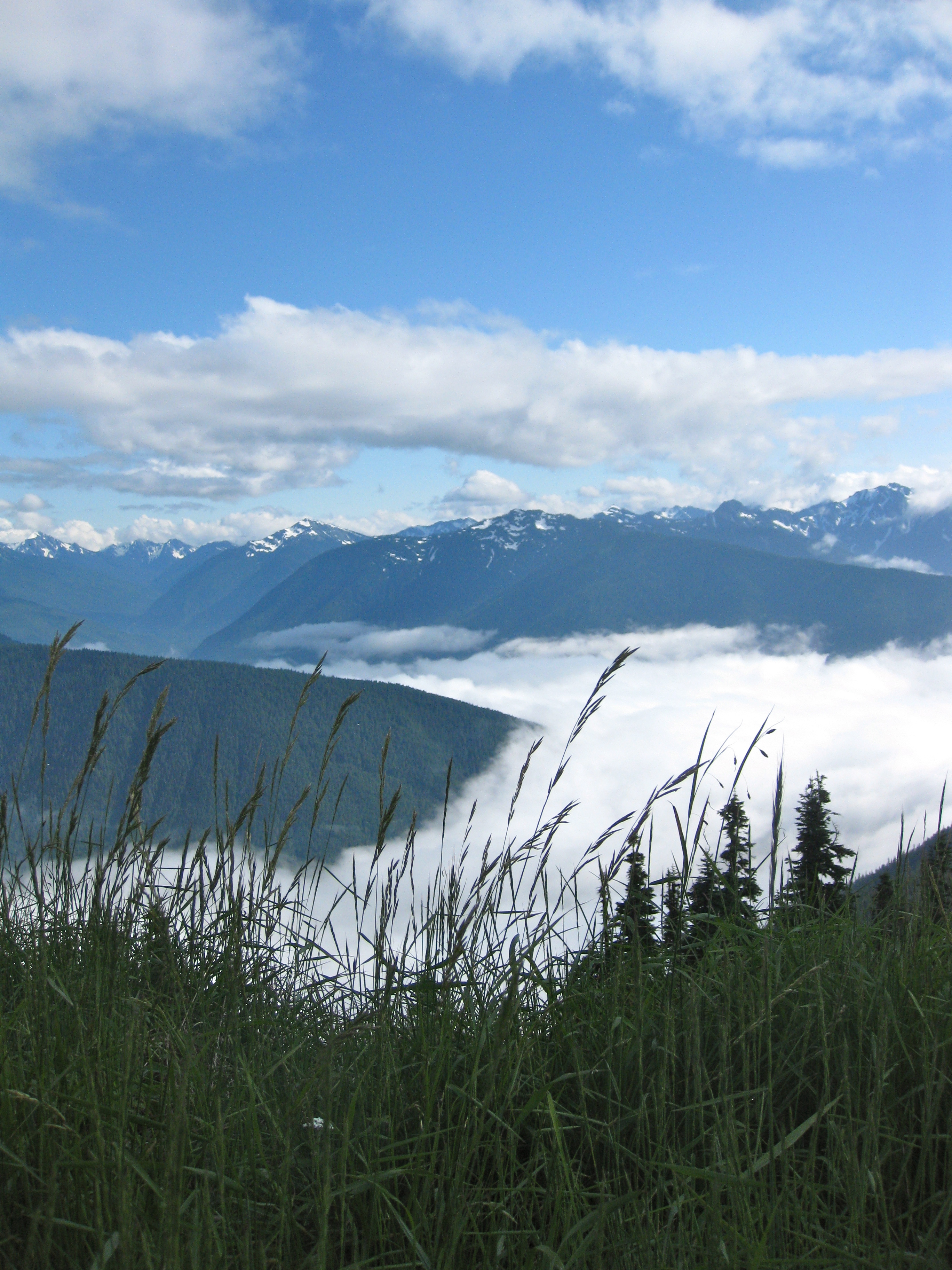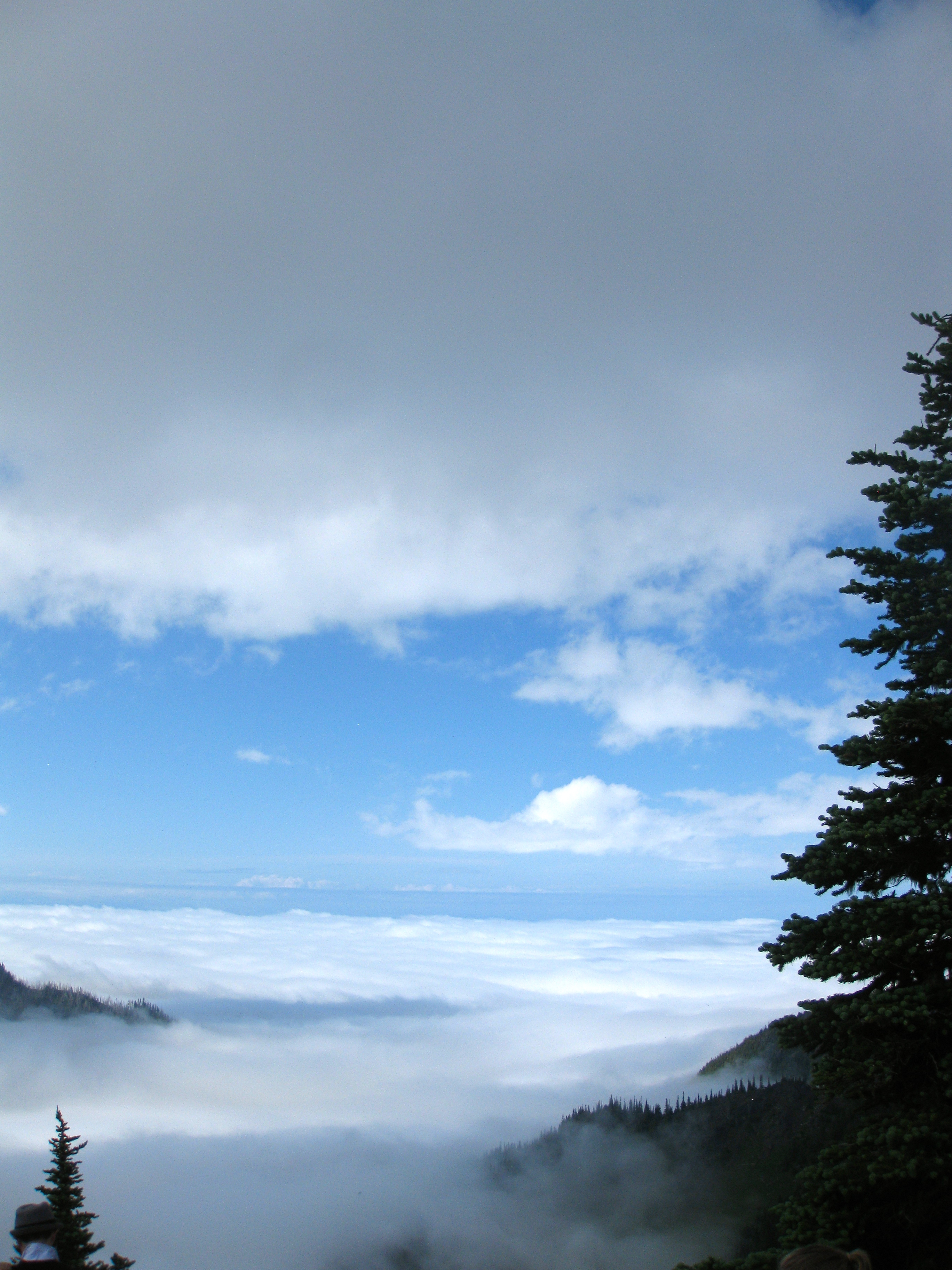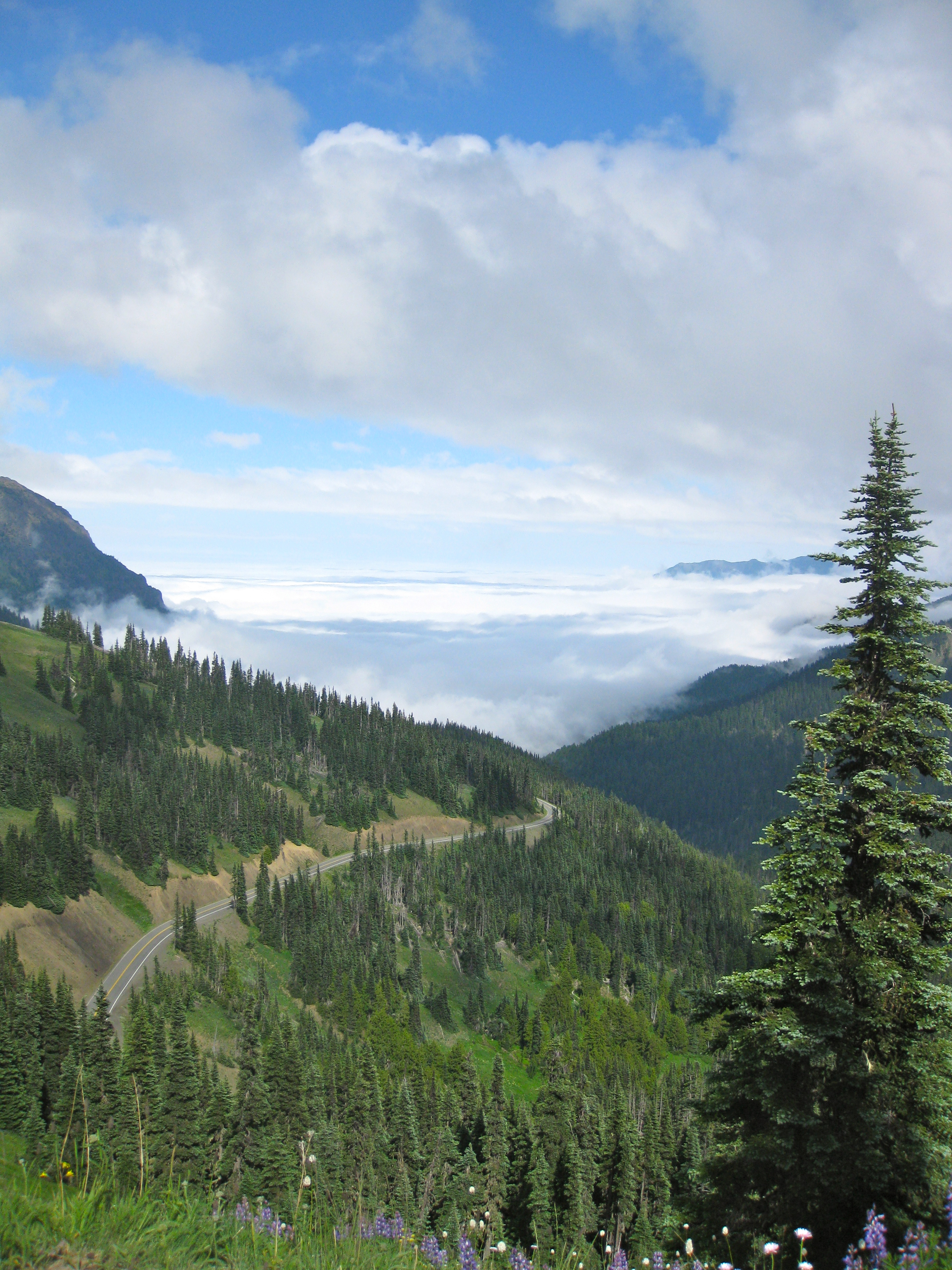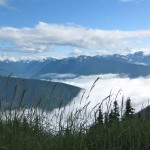 Donning a few extra layers we took a look around the area; to the west stood Mt. Olympus and the rest of the Olympic range; behind us were fields of lupine (a purple alpine flower), and all around us, as the click of several cameras indicated, were deer with their yearling fawns, out grazing in the fields. Making our way toward the visitor center Mom drew close to a deer grazing on a hillside; apparently when there are as many of them on the ridge as there are squirrels in central park, they become fairly accustomed to tourists with cameras. I took the first of many shots just as a woman started clapping to scare the animal off, in the interest of not letting it get domesticated. She had, of course, become an animal behavior expert after she’d finished taking her own pictures; Mom gave her the evil eye “What the heck did she do that for?” I patted her on the back and glared right along with her–damn right, Mom. The deer stuck around anyway.