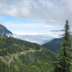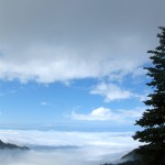 We then pressed on to the bottom visitors’ center of the National Park. With news that the road was open (snow-ins can happen year round) we started the 17-mile drive to the top of the ridge, and were treated to ever-expanding views of the surrounding mountains. About halfway up the road the cloud cover choked out the light and we found ourselves driving half the speed limit in a cloaking fog, unable to see more than 30 feet in front of the car. As the car rose higher the fog cleared, but the upper cloud cover lingered, blocking out the sun as we reached the top parking lot.