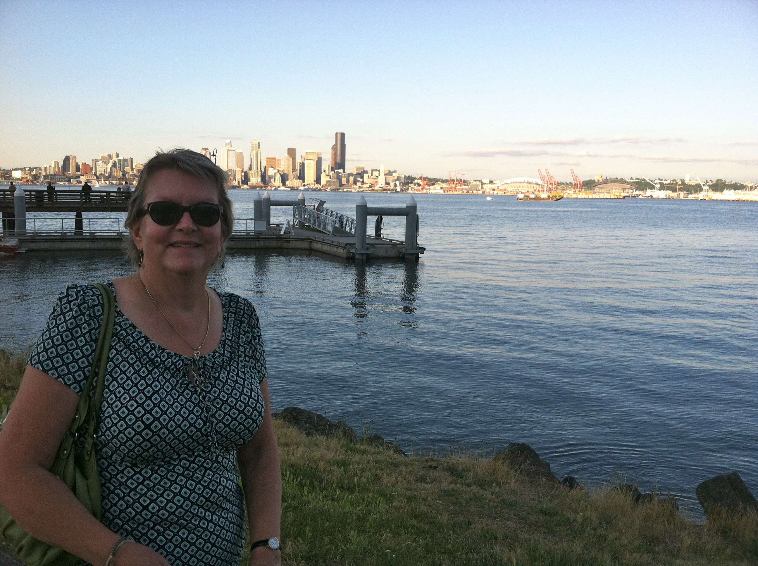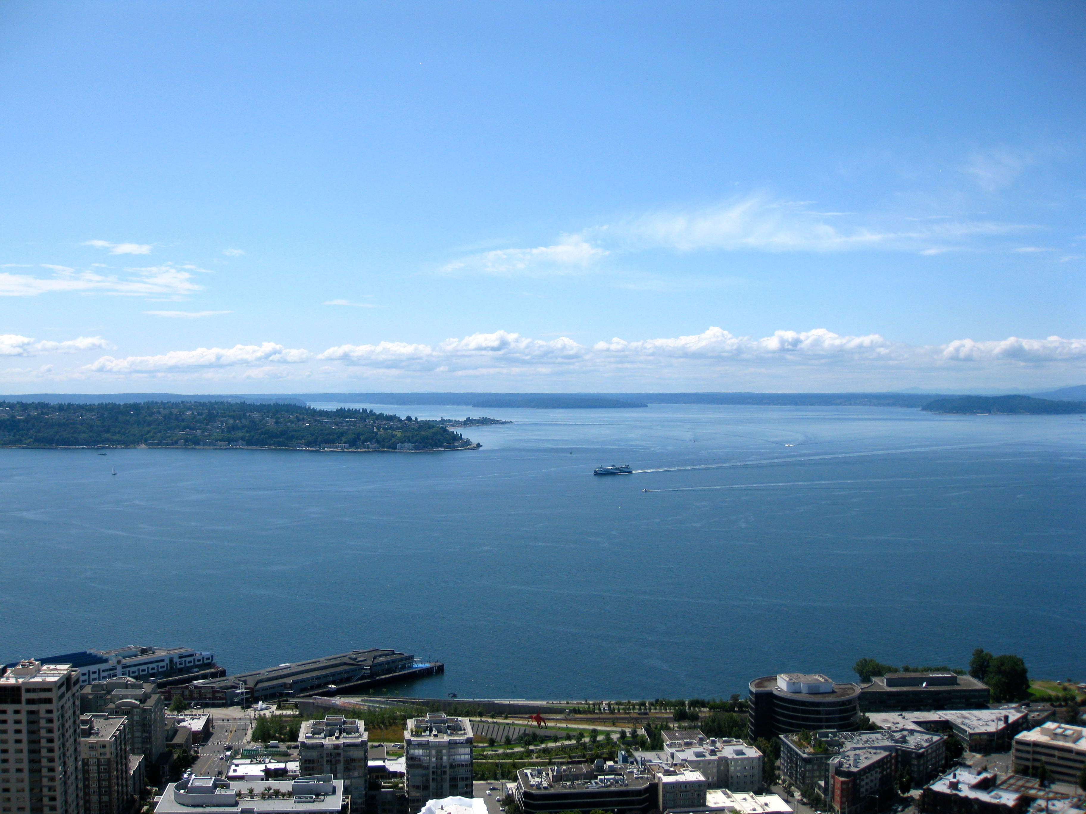 The next stop was the Space Needle, which Kevin has free access to as an employee. After a short wait in line (where we met a young woman and her grandmother–who happened to have been born in Waterbury, CT, of all places) we packed into a bullet-shaped elevator for the 40-second ride to the observation deck. Moderately crowded, the deck offered a chance to observe the city under the clear blue Seattle sky (rare phrase). We were less impressed with the viewing scopes than we had been at the Elwa Dam, but we were able to spot Kevin and my work buildings so Mom could take a picture to document the place of my mental atrophy. We were lucky to have such a clear day and eventually tore ourselves away from the view of ferries criss-crossing the sound under a towering Mt. Rainier.