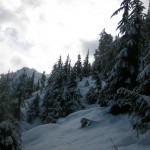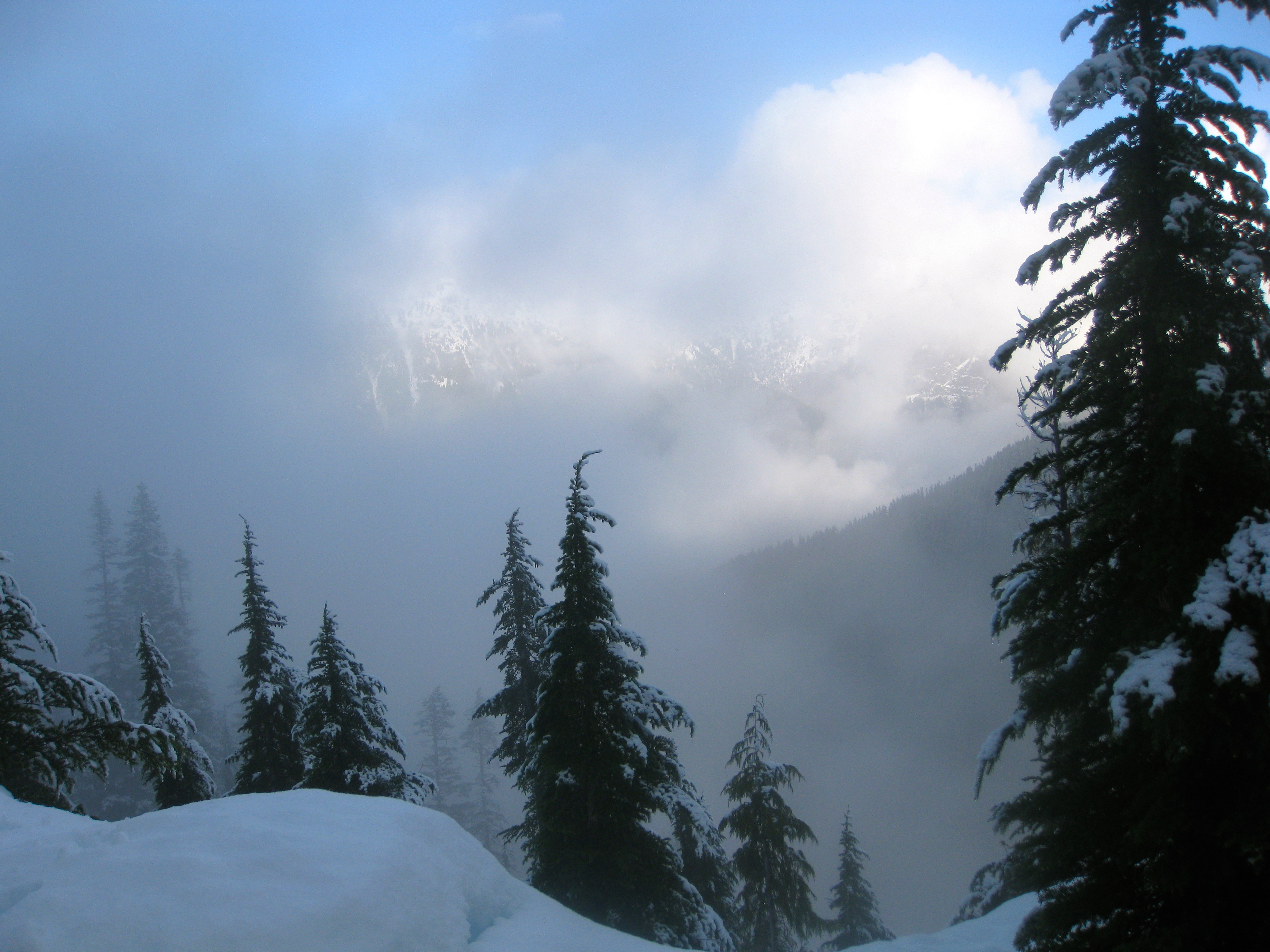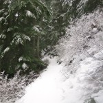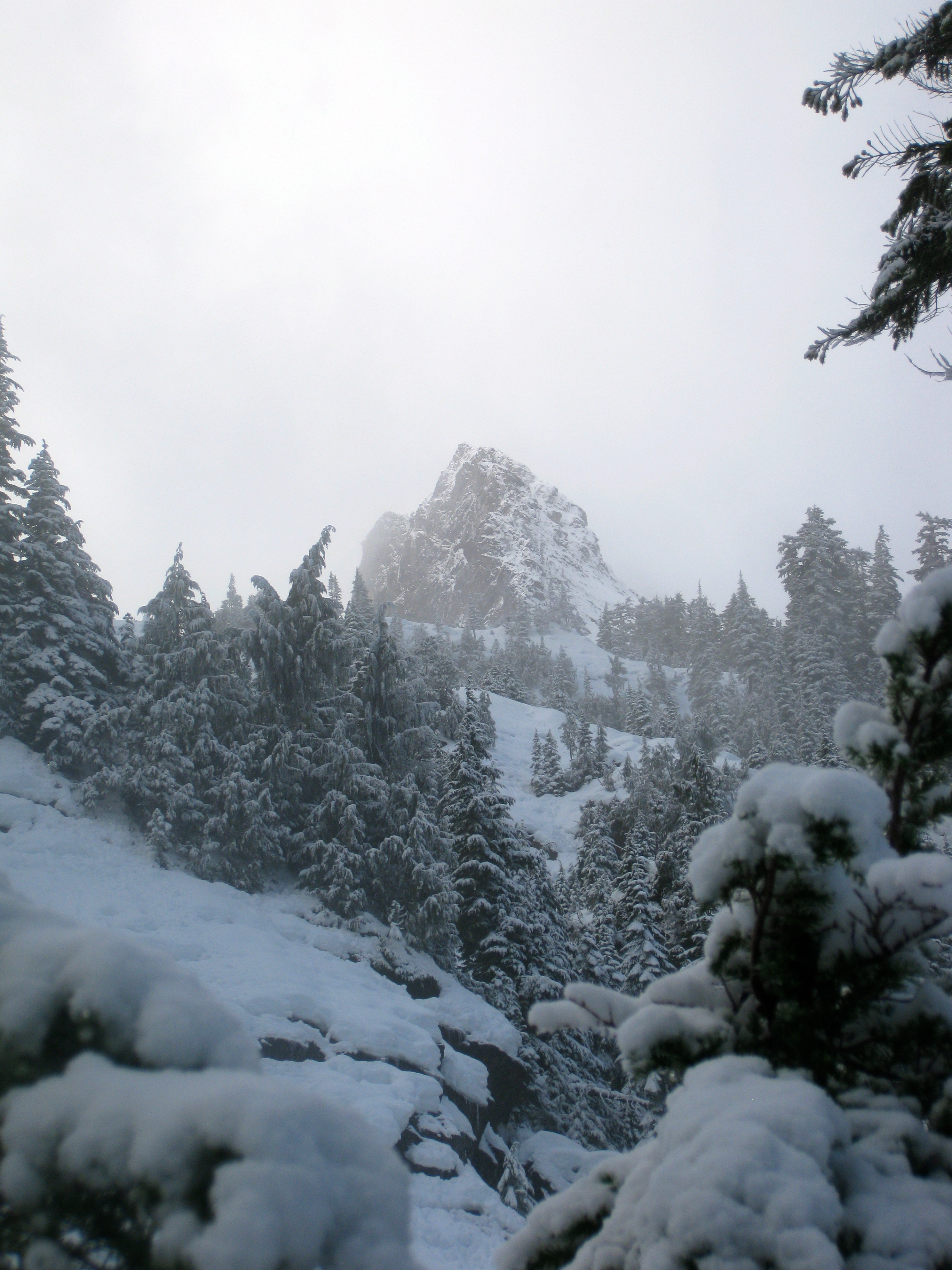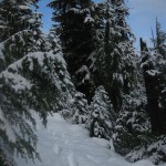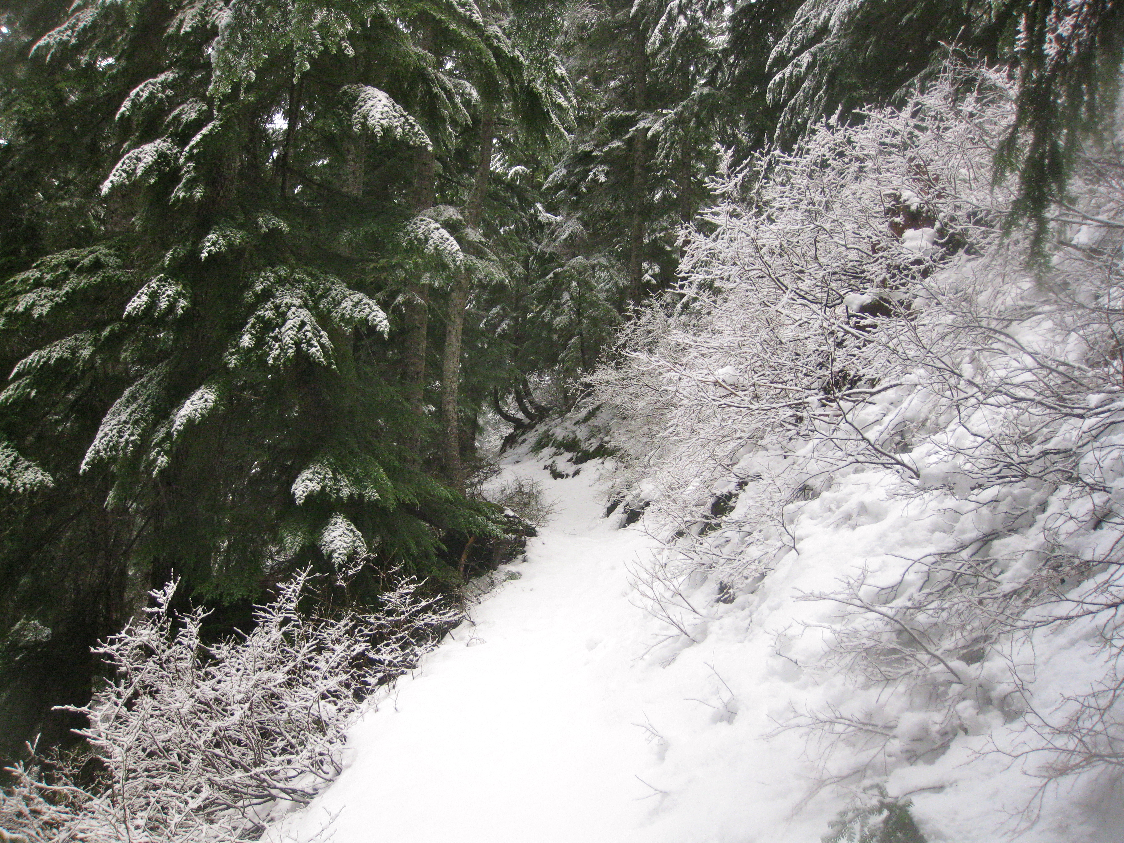 After about an hour of hiking (maybe 2-3 miles uptrail) the mist turned to snow and the trail sported more white carpet than Scarface’s livingroom. In the sheltered openings between trees the air was still as flakes bonded into clumsy masses on the tops of branches. With the snowcover I realized that I’d be the first one up today–the first one up in a while–there were no other depressions in the trail to indicate a footfall on the snow. It was encouraging to think that I’d be alone at the top. While not a summit or climb of note, it would offer a moment when I’d have a space in time with these mountains; a brief hour in their expansive existence in which they’d allow a lone human to be the sole admirer of their indifferent beauty.