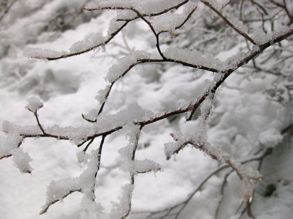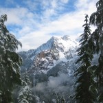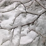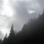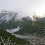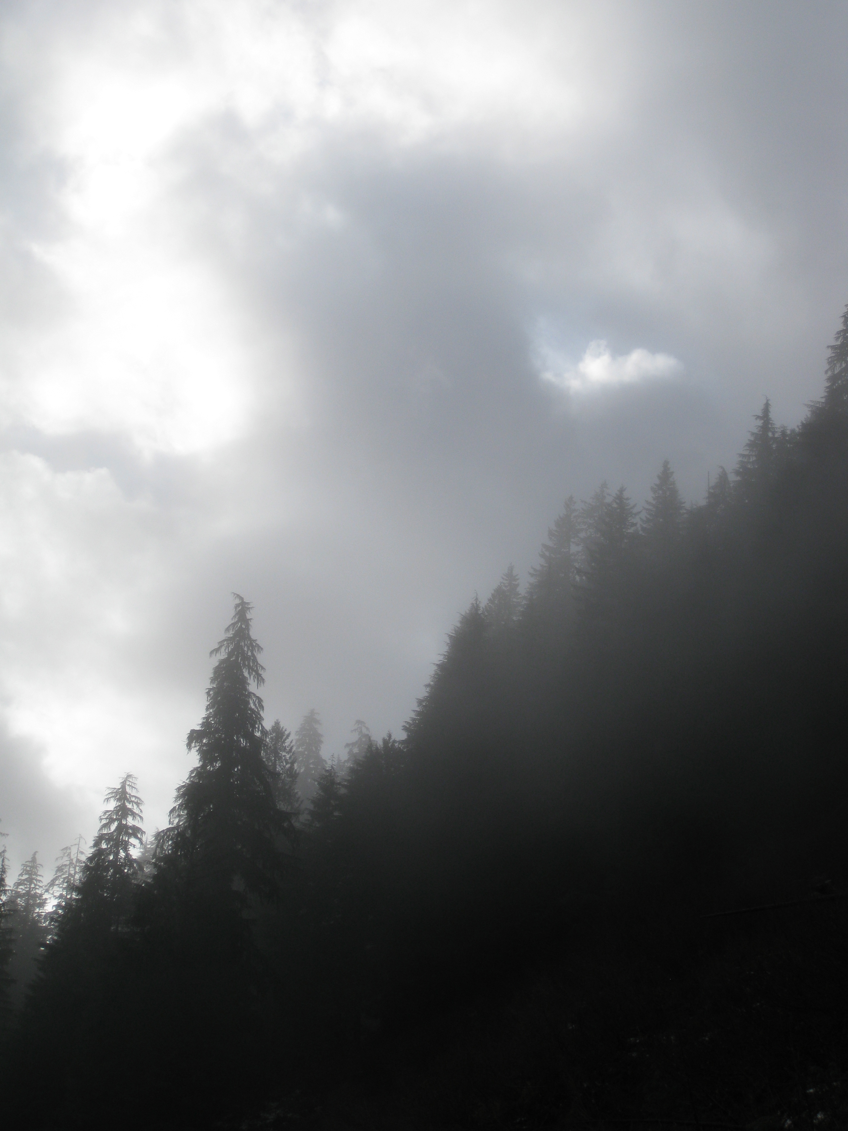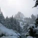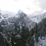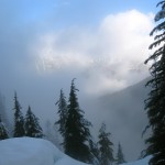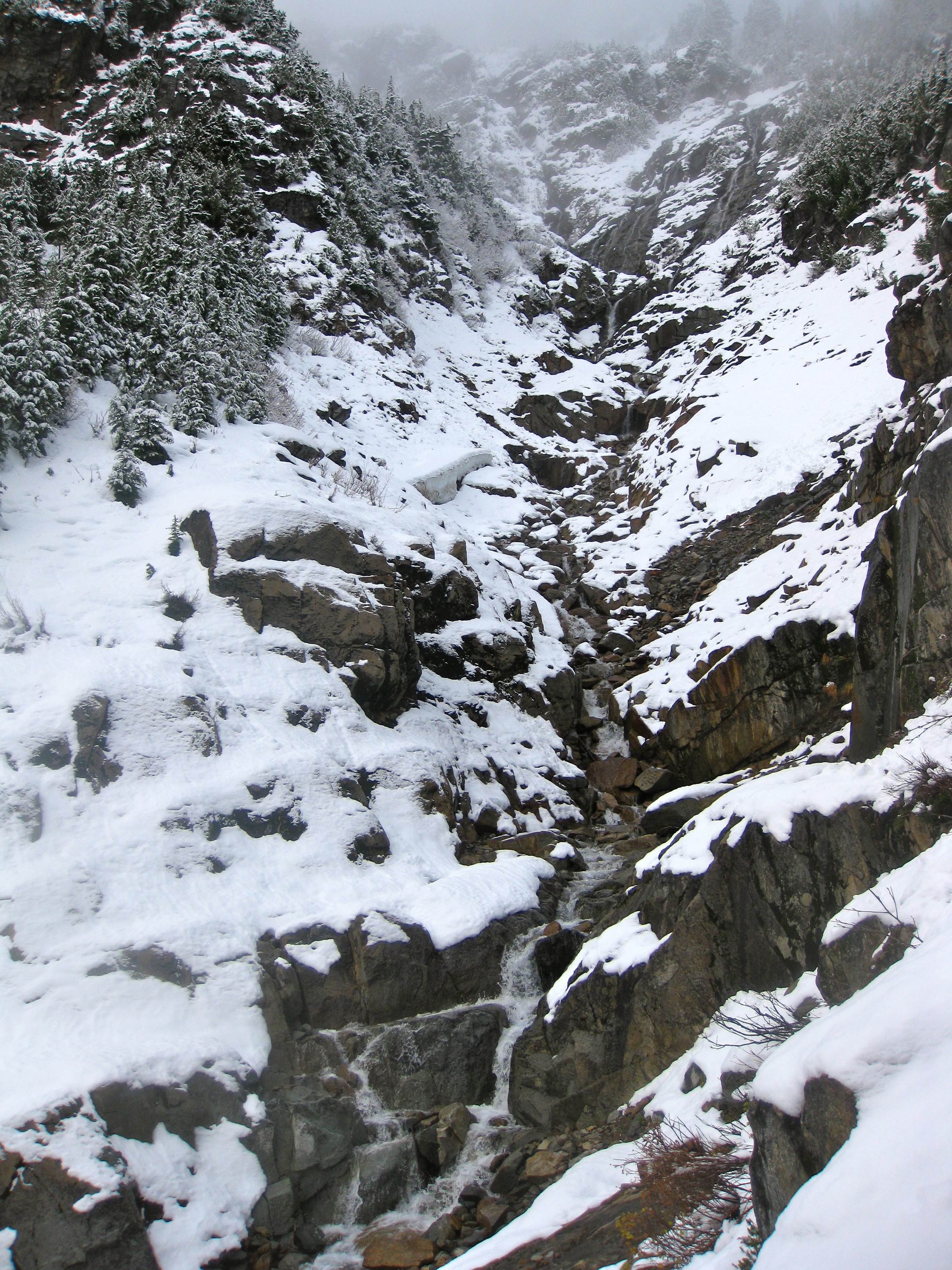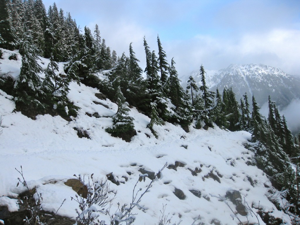 After about an hour of hiking (maybe 2-3 miles uptrail) the mist turned to snow and the trail sported more white carpet than Scarface’s livingroom. In the sheltered openings between trees the air was still as flakes bonded into clumsy masses on the tops of branches. With the snowcover I realized that I’d be the first one up today–the first one up in a while–there were no other depressions in the trail to indicate a footfall on the snow. It was encouraging to think that I’d be alone at the top. While not a summit or climb of note, it would offer a moment when I’d have a space in time with these mountains; a brief hour in their expansive existence in which they’d allow a lone human to be the sole admirer of their indifferent beauty.