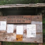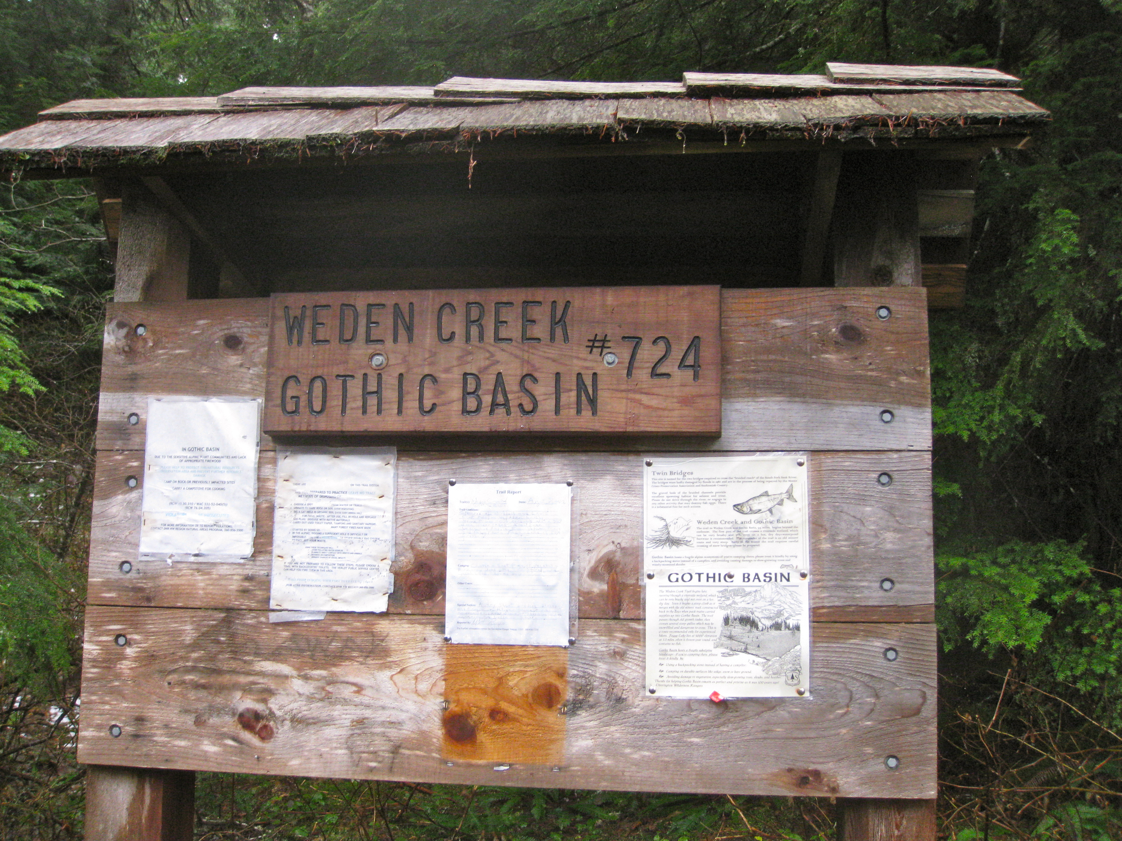 Eventually you’ll hit the river, bear right (at about a mile) and come to a kiosk for Gothic Basin. Now you can carry on a bit less perplexed. After another half mile or so you’ll reach a stream crossing, which as the book mentions, can be tricky at high water.