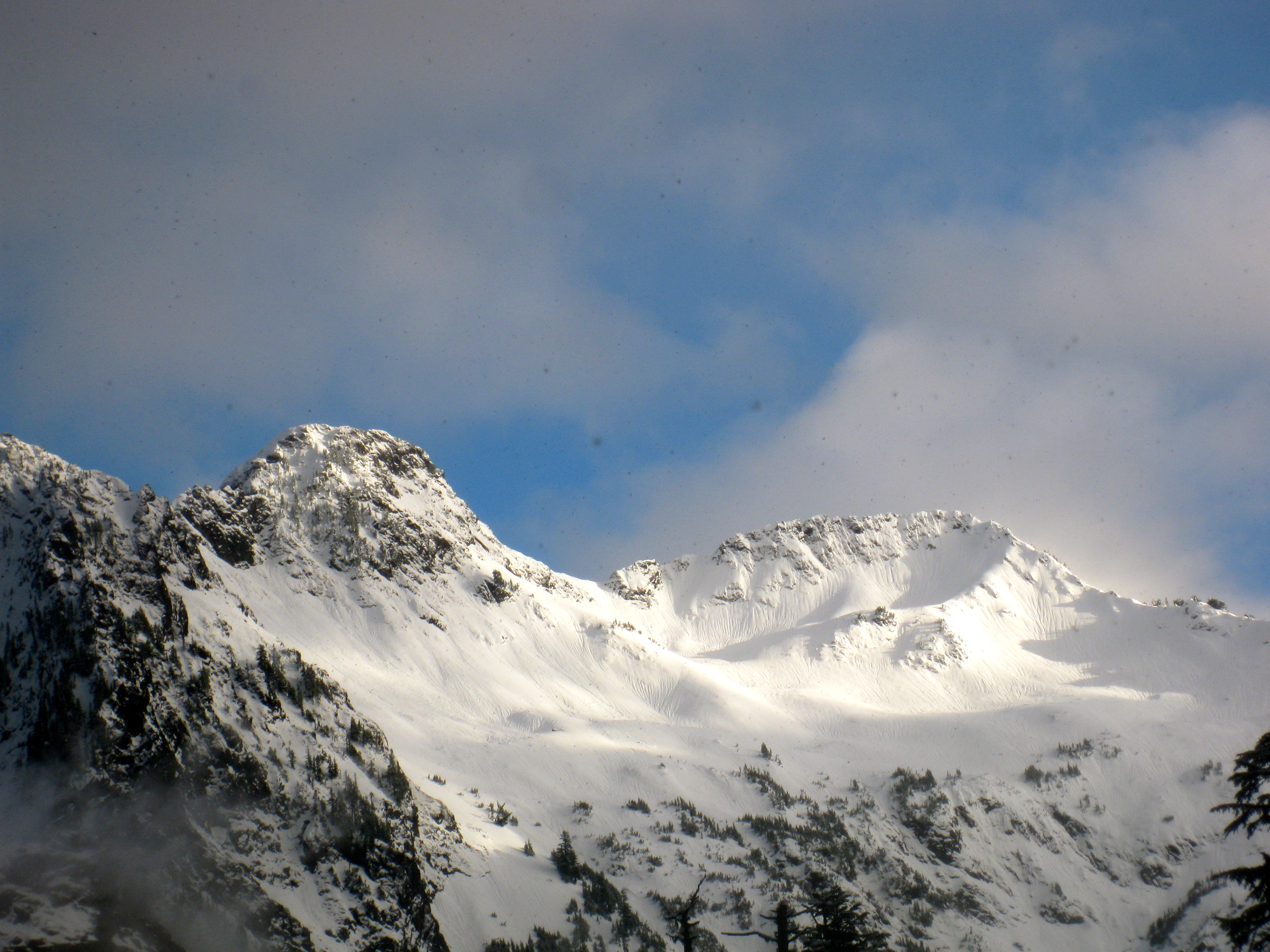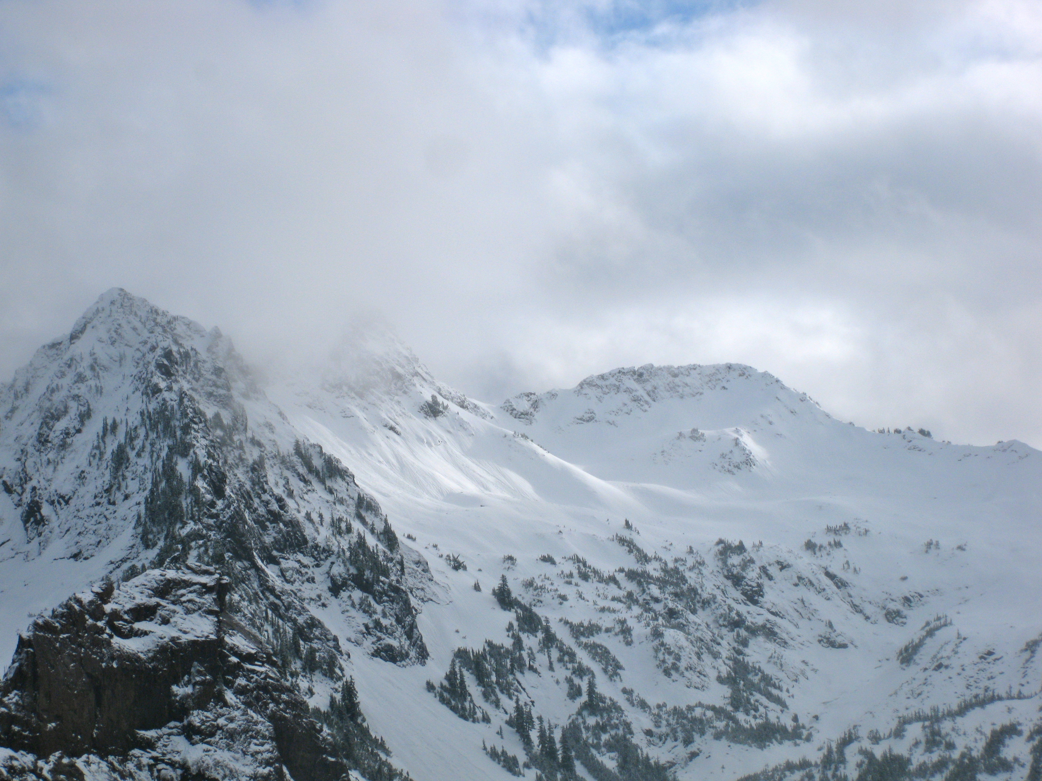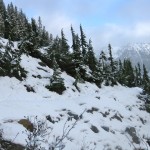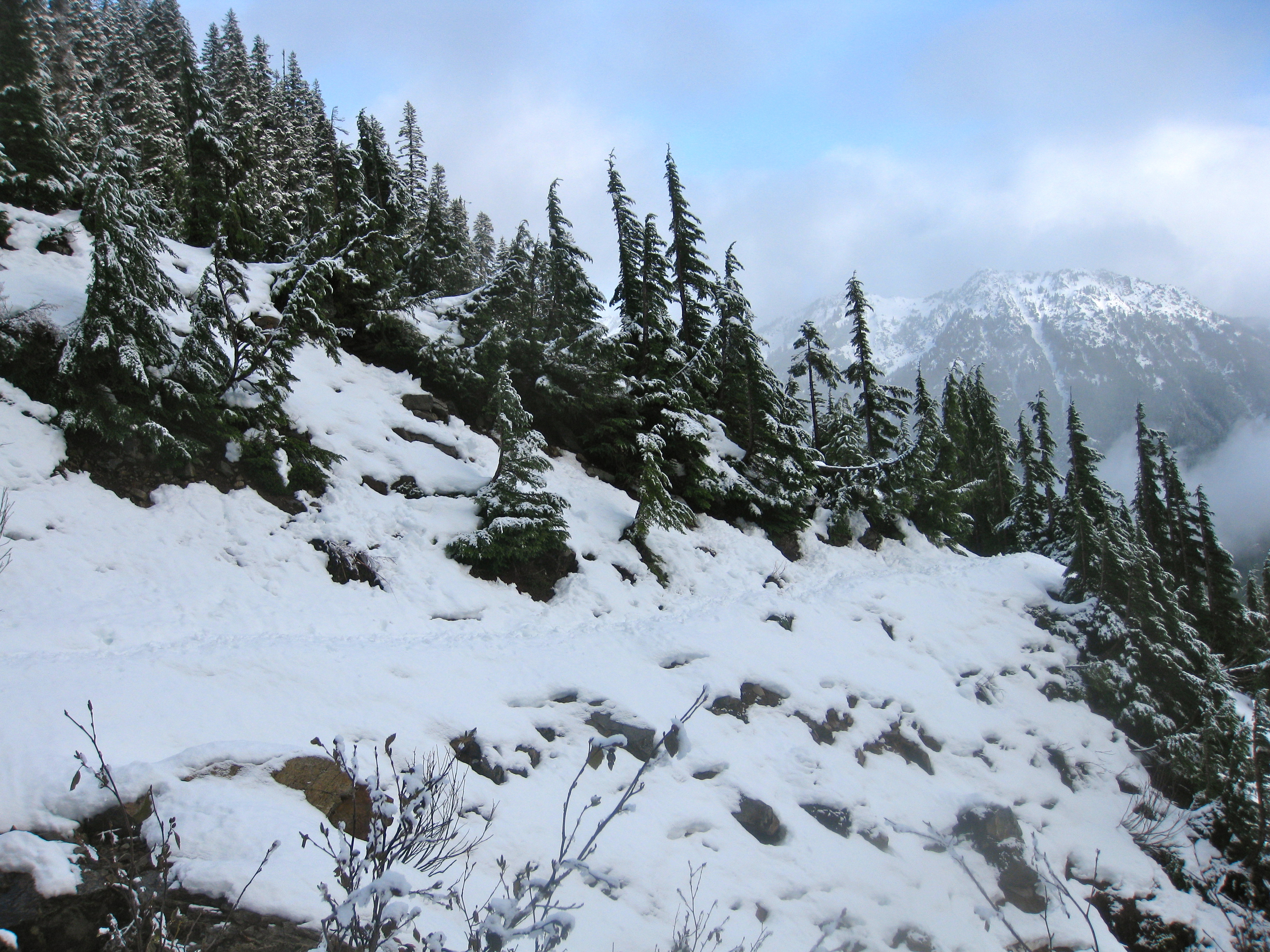 Eventually I left the old growth and ventured out onto the ledge, which gave panning views of the surrounding mountains. As I worked my way around to the south the aspect of the peaks changed, revealing glimpses of far-away snowfields and still-forming cornices. I came to several stream crossings which presented no problems, and continued up my best guess as to where the trail was. The path that had been so clearly defined was becoming increasingly lost in the snowy terrain.