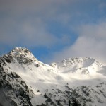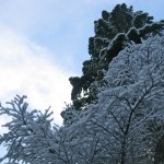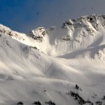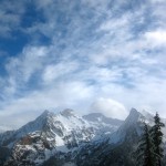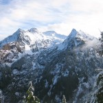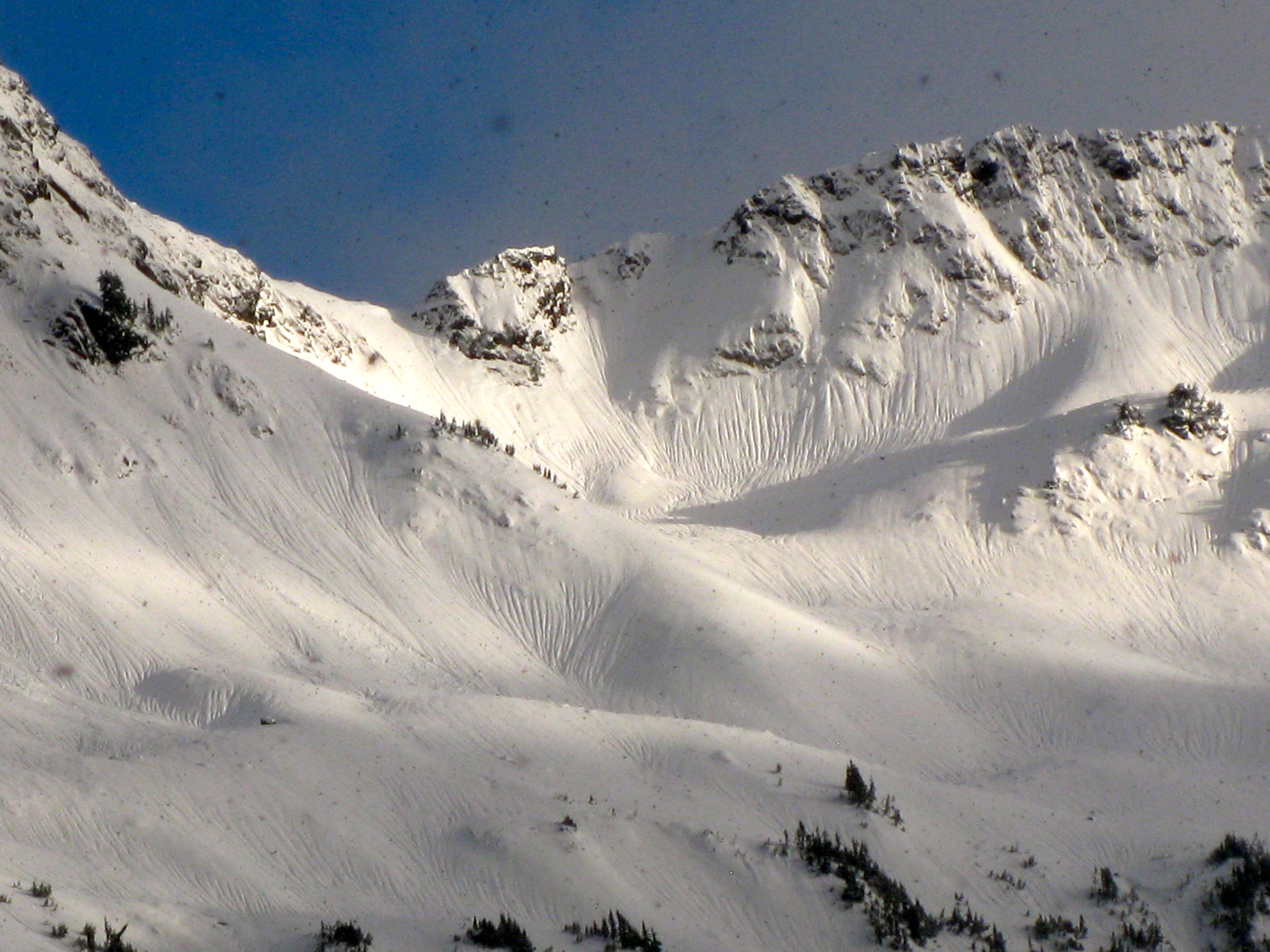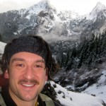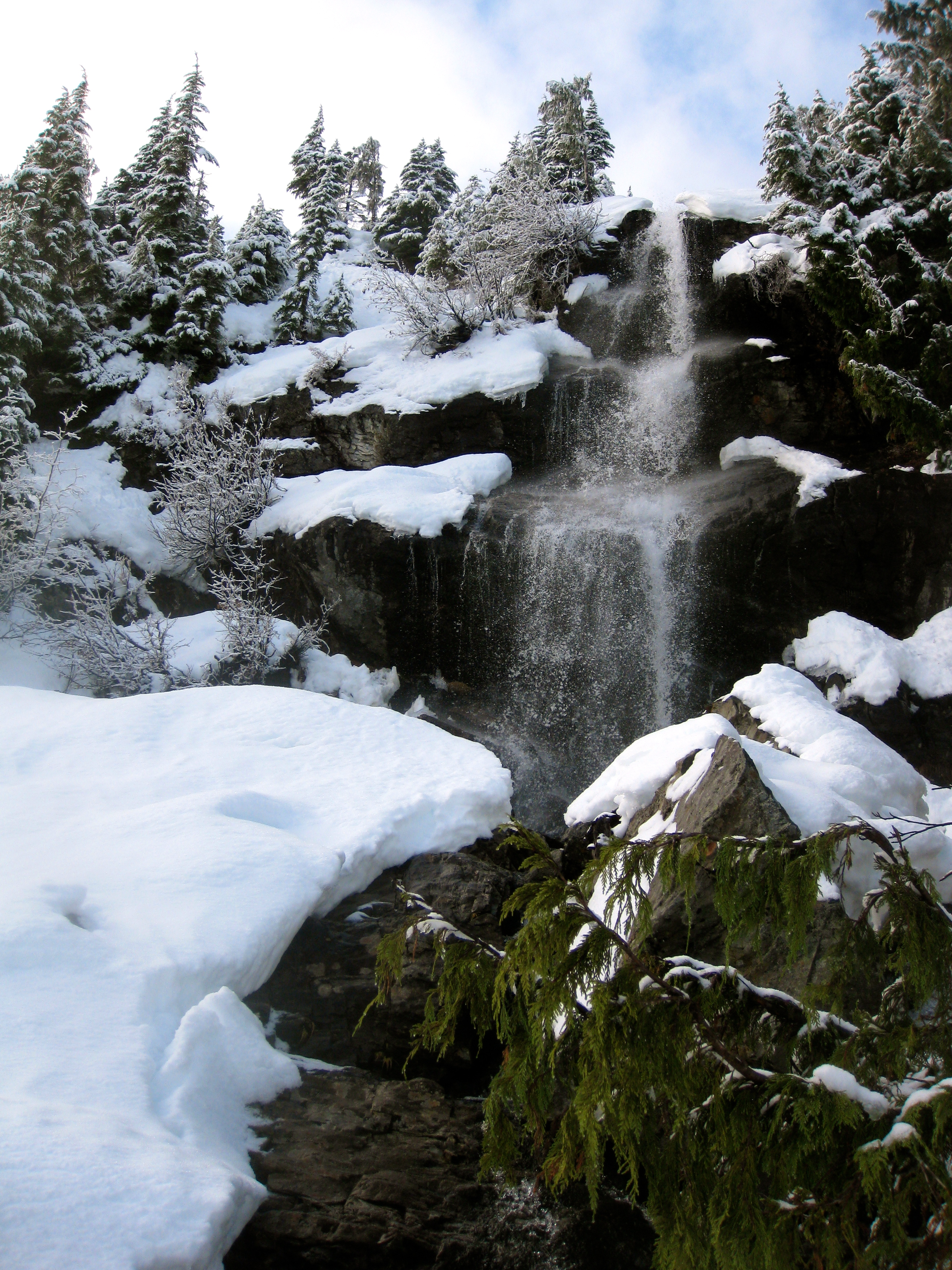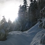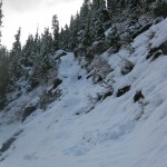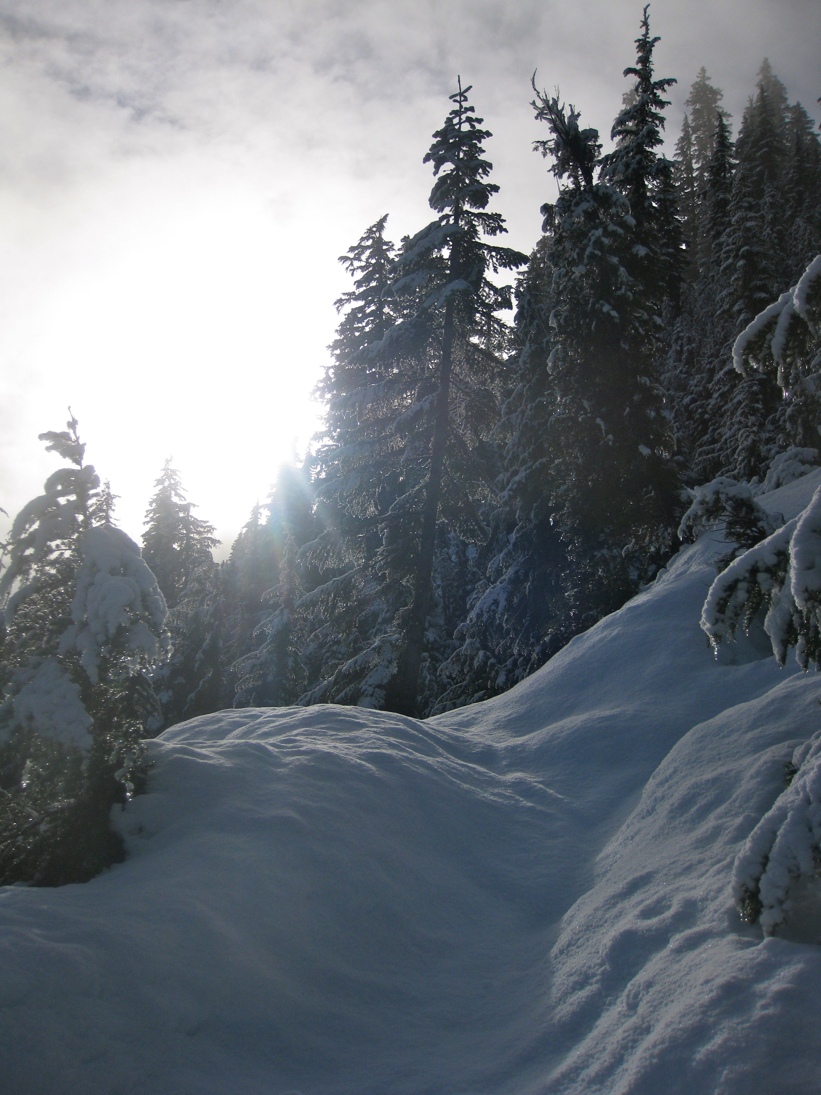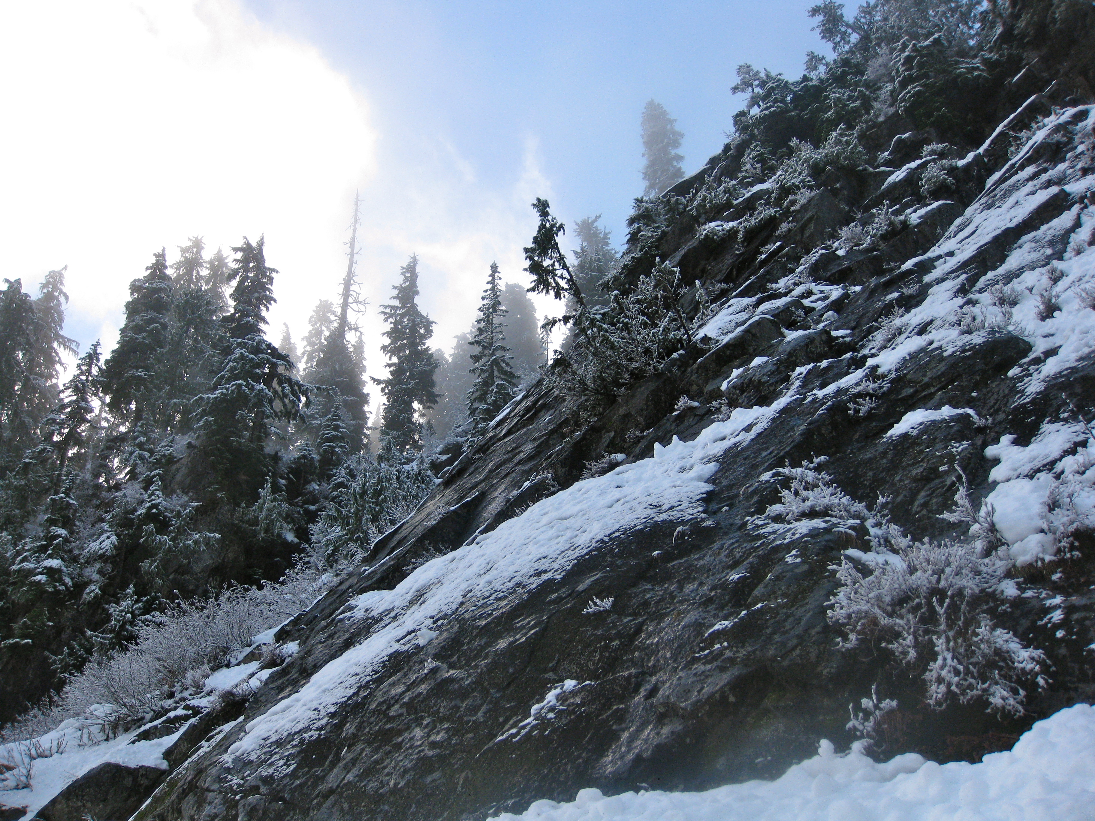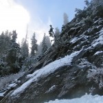 Standing in thigh-deep snow I toe with my right foot, pushing forward with my knee until I feel the scrape of metal on stone. I push off my poles slowly, adjust my center of gravity, and stand on my new foothold. Slowly I bring my left leg up, pendulum at the knee, and beat back the snow, but as I search for another hold my left pole gives way and plunges deeper into the snow, sending me sprawling backwards and sliding several feet until my crampon catches on the base of an evergreen. Lying there I can’t help but think that at least it smells nice.