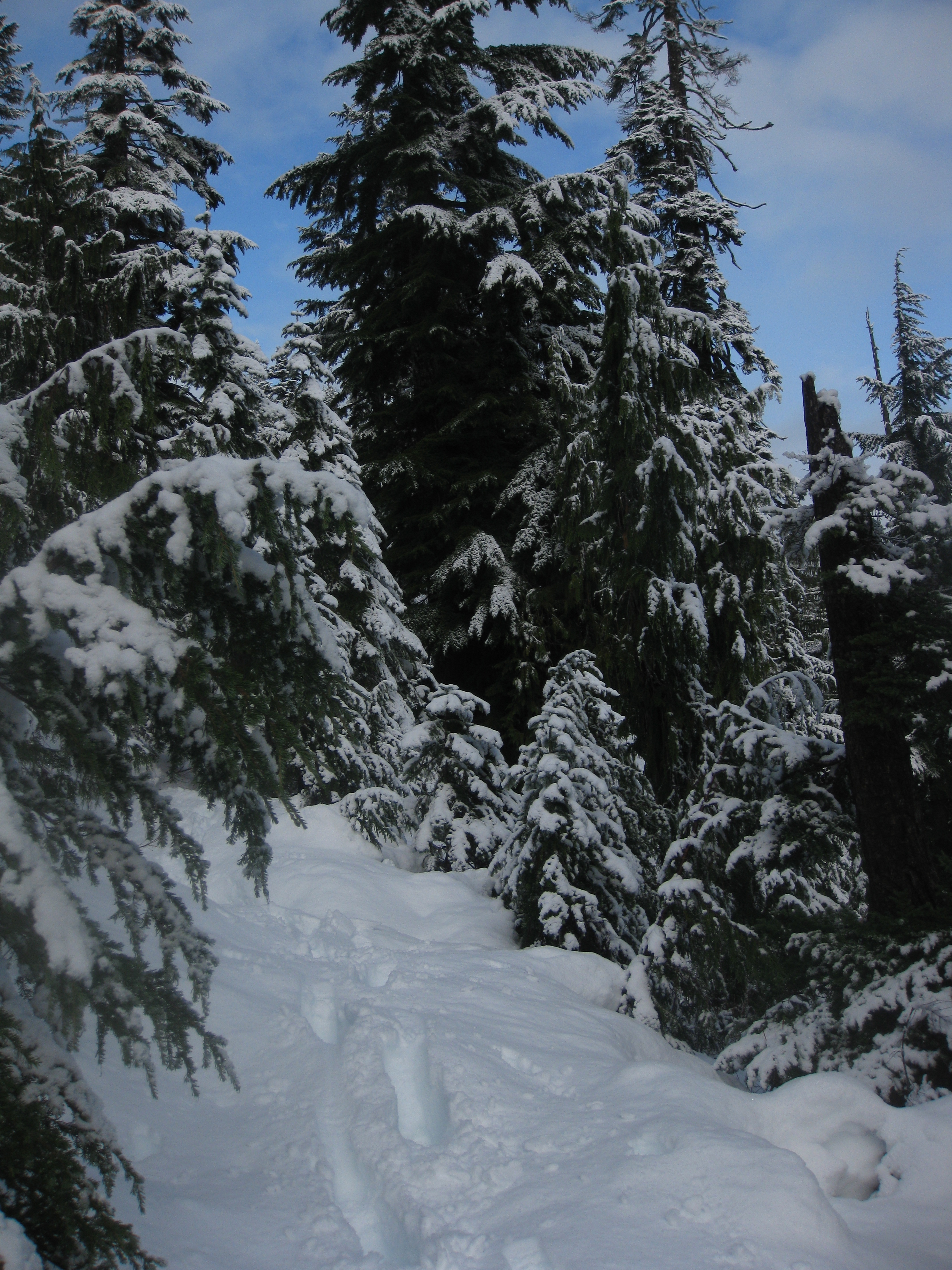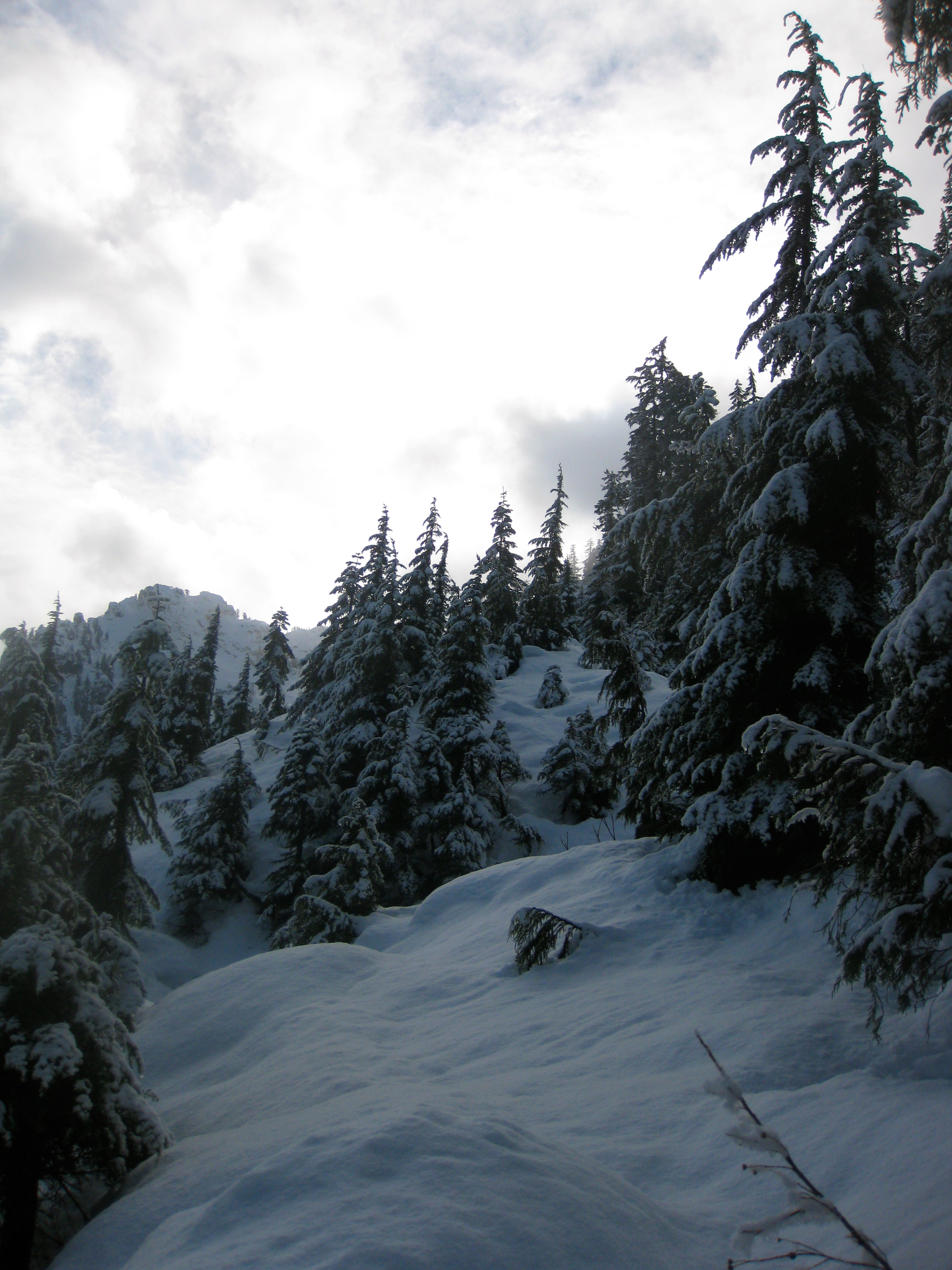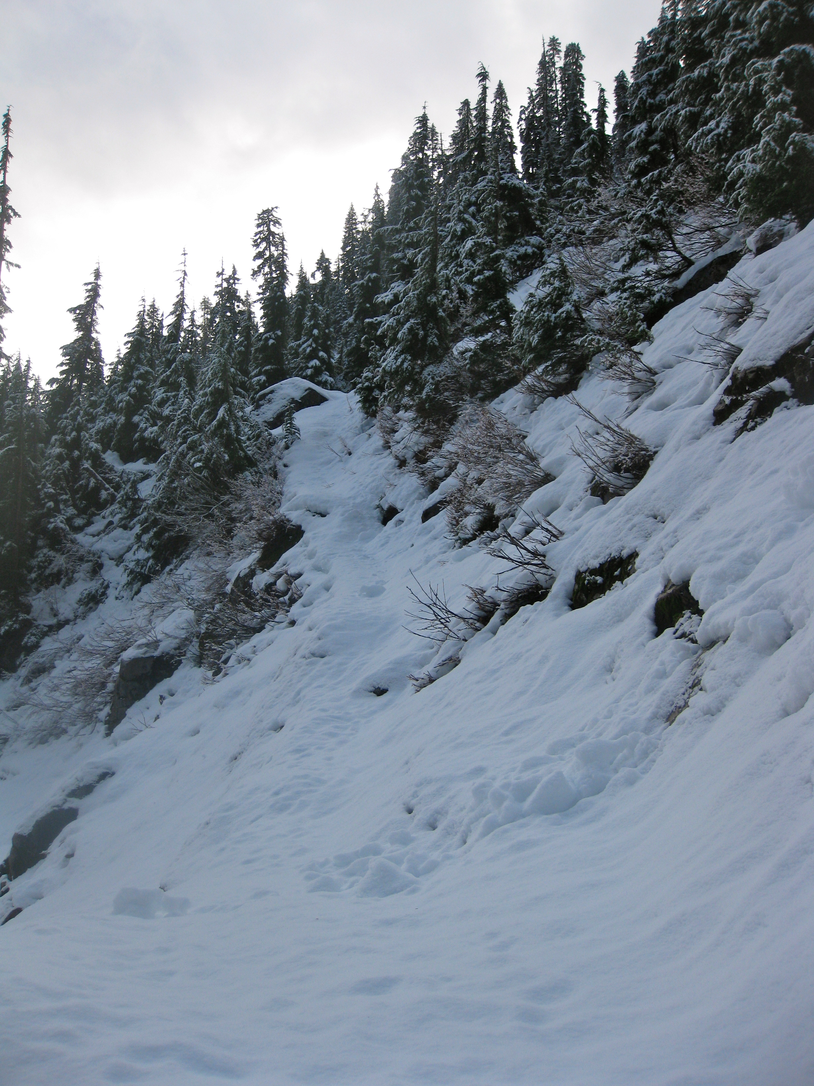 Betting on my best guess, I continued up the side of the mountain, the snow noticeably getting deeper and spilling over the tops of my gaiters, which I cinched down. Approaching the scramble section (in the summer months, anyway) I decided to throw on my crampons in the hope of getting some toe holds. My pace dropped from about 2 miles an hour to half a mile an hour as I swam through the fluff that refused to bear anything but the lightest weight. Walking in the middle of the trail became one prolonged, off-balance situp in deep snow. Walking on the side in the tougher, impacted snow that fell from the trees bore the risk of post-holing into whatever was below. As the terrain steepened, falling backward began to lose its comical appeal.