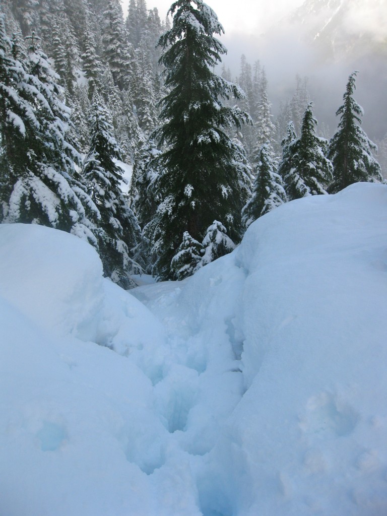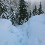 Cresting ridges I began to study routes before walking on, tracing them up as far as I could see, attempting to discern where the actual trail was and what was just open white space. Some of the stream crossings came after navigating steep ledges that ended in the river 60′ below, causing me to mentally double-check who I’d filed my trip plan with. If you’re not comfortable with route finding or traveling on snow, this would probably be the point to turn around.