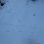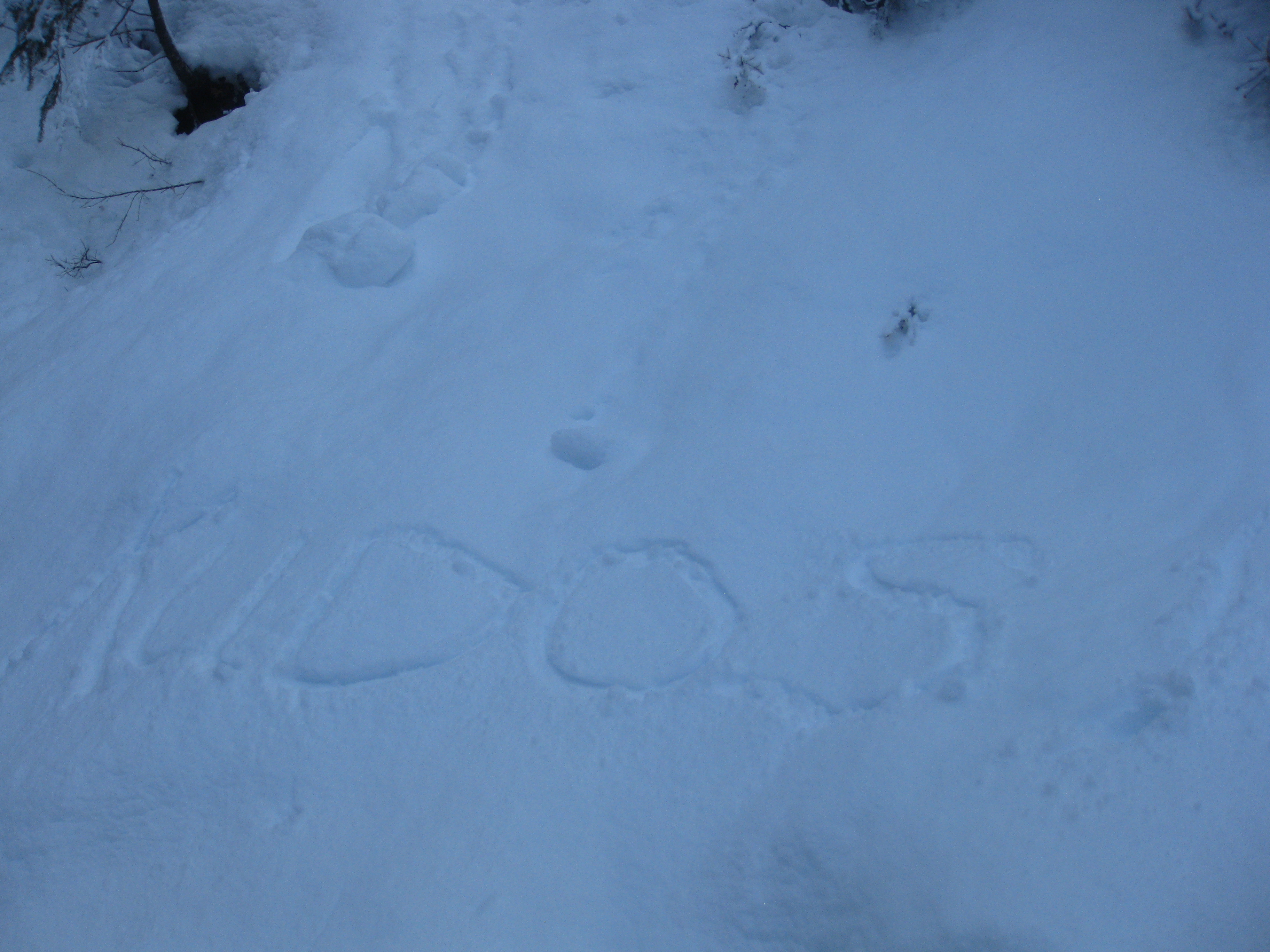 The levels of snow dropped quickly with my descent, and before I knew it I was back in ankle-deep snow wondering if I could have pressed on. I began to notice a new set of tracks, punctuated by a note drawn in the snow that told me my other trail friends had been through.